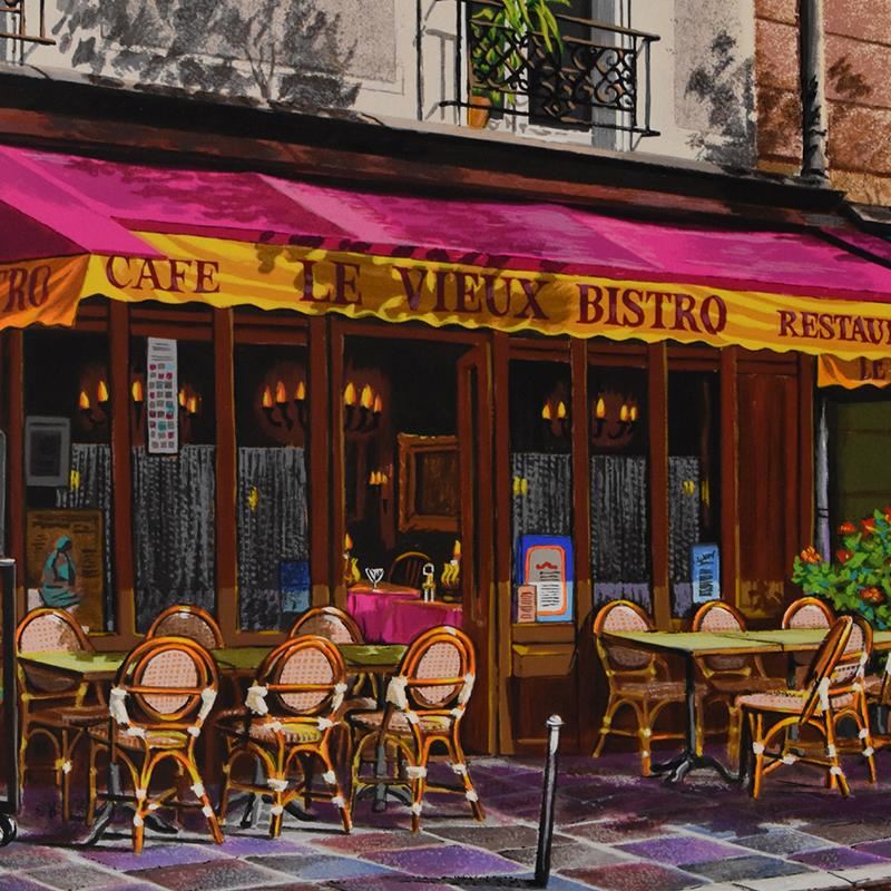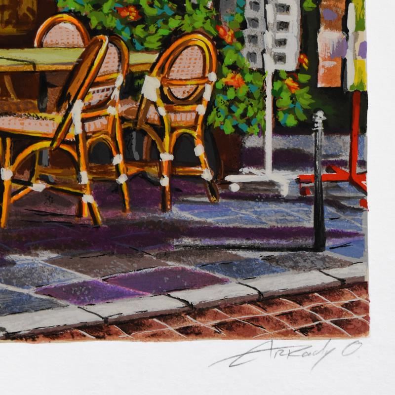 "Le Vieux Bistro" is a limited edition serigraph on paper by Arkady Ostritsky, numbered and hand signed by the artist. Includes Letter of Authenticity. Measures approx. 25.5" x 20" (border), 23" x 17" (image).