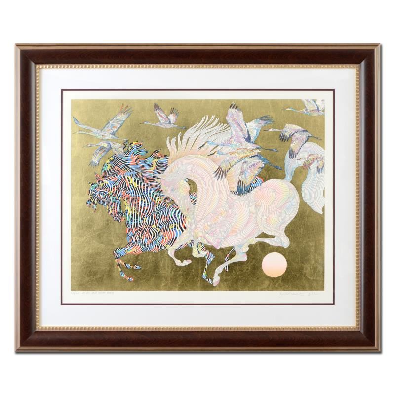 "Le Vol Des Grues" is a limited edition serigraph with hand laid gold leaf on artist paper by Guillaume Azoulay, numbered and hand signed by the artist. This piece comes custom framed. Includes Certificate of Authenticity. Measures approx. 46" x 38.5" (frame); 32" x 24" (image).