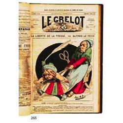Le grelot. Paris, 1ère et 2e années, du num. 1 (9/4/1871) au num. 90 (29/12/1872) + n. 22 bis, soit 91 fasc. - 5e et 6e année, du num. 195 (3/1/1875) au num. 299 (31/12/1876), soit 104 fasc. - de la 19e à la 22e année, du num. 940 (14/4/1889) au num. 1092 (13/3/1892), soit 152 fasc.     Soit 347 fasc., in-folio, reliés en 3 vol., demi-percal., le dernier avec dos restauré d'une bande de percal. moderne.  Diverses déchirures +/- marginales, rouss. marginales, sinon bonne condition générale. Cfr. ill € 375/500 Tête de collection de cet hebdomadaire satirique républicain, anti-communard, anti-boulangiste, dont la publication se termina en 1903. Les "unes" sont illustrées en couleurs de caricatures par Bertall, Darjou, Flock, A. Le Petit, Demare, Pépin...  Le num. 22 est en double ex., avec date et texte identiques mais illustration différente (respect. signée "Caporal" et titrée "Actualité" et signée "Bertall" et titrée "Les deux empereurs").  Ref. Ph. Jones, La presse satirique illustrée, p. 62-63.