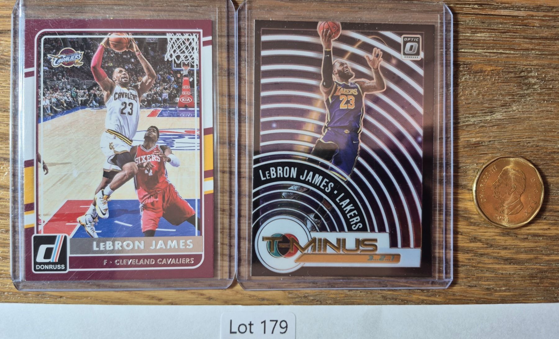 Pair: 2015-16 Donruss base #144 (Cavs) + 2020-21 Optic T‑Minus #9 (Lakers).