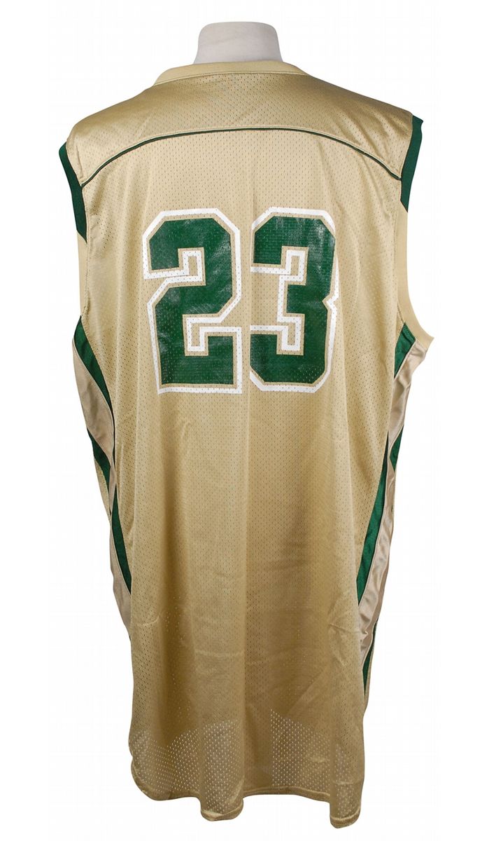 Game-used official gold mesh On Sports St. Vincent–St. Mary High School home jersey circa 2002, featuring his number 23 screened in dark green to the chest and back, with the chest also bearing the team nickname, "Irish.” The On Sports tag is sewn to the bottom left and indicates a size XXL. Exhibits a few marks and wear consistent with use. Left breast of the jersey bears an American Flag embroidered ribbon worn in remembrance of 9/11. Accompanied by a letter of provenance from authorized purchaser and re-seller of Saint Vincent-Saint Mary's merchandise and apparel Brad Gart, which states that he purchased this directly from the school at a used clothing fundraising sale held in its wrestling and baseball practice facility. Also accompanied by a letter of authenticity from Collectibles Palace certifying the jersey’s apparent game use. The first of Lebron James’ 16 Sports Illustrated covers dated February 18, 2002, features James pictured in an Akron St. Vincent-St. Mary high school jersey with a headline reading: ‘The Chosen One: High School Junior LeBron James would be an NBA lottery pick right now.’