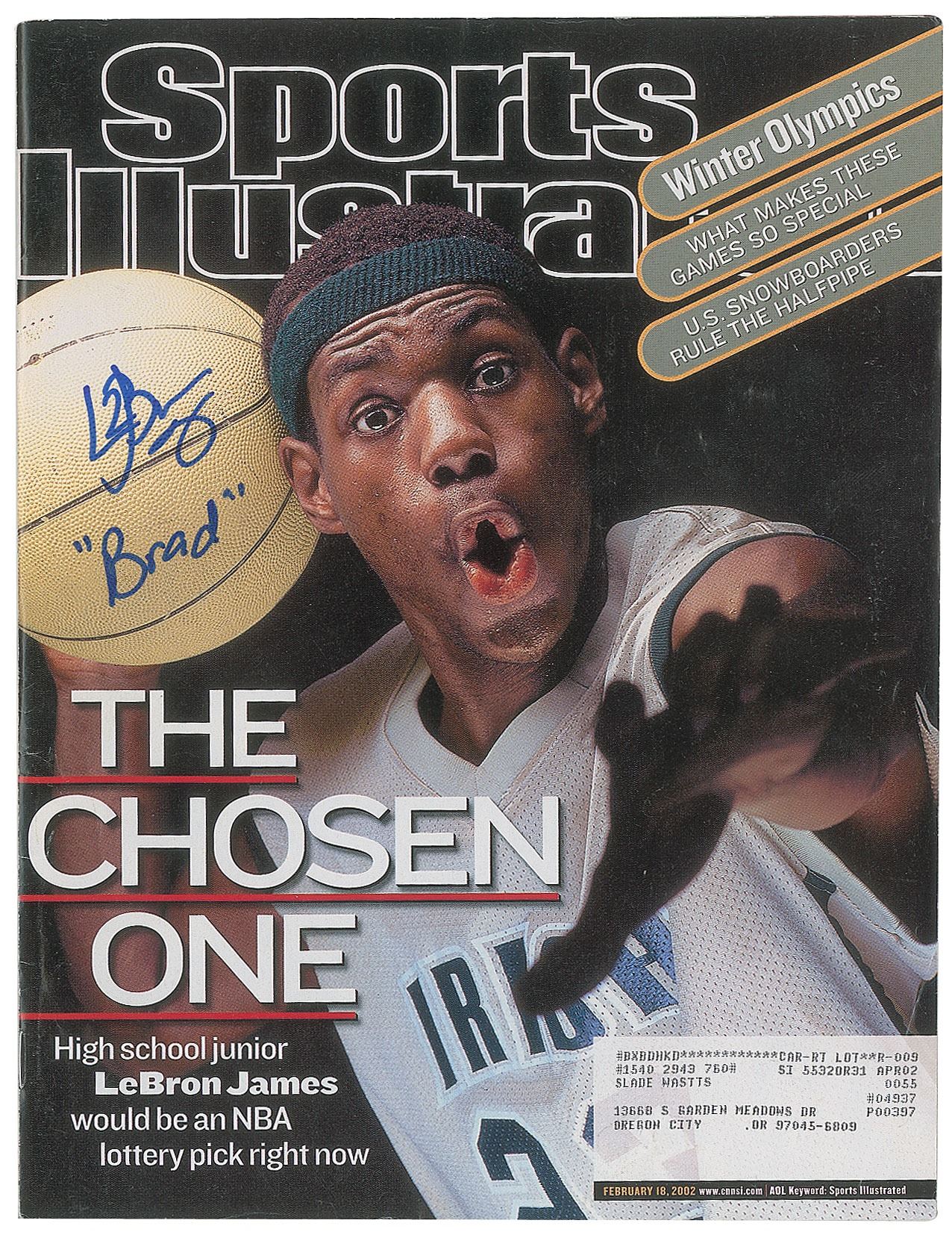 Sports Illustrated magazine from February 18, 2002, with front featuring LeBron James as a member of the St. Vincent–St. Mary High School basketball team, with bold main cover line, "The Chosen One," signed and inscribed in blue felt tip, "LeBron James, 'Brad.'" In fine condition.