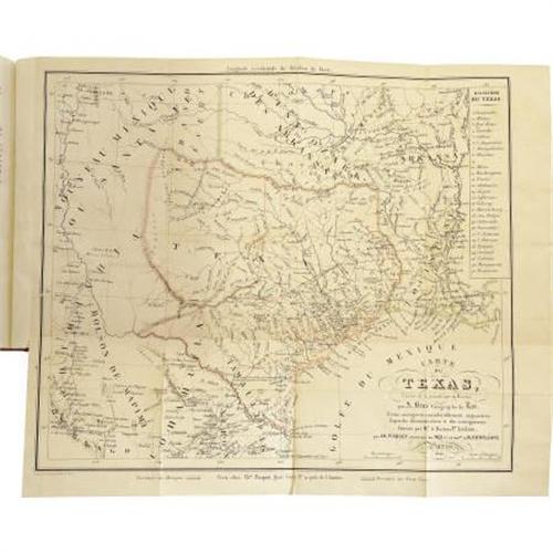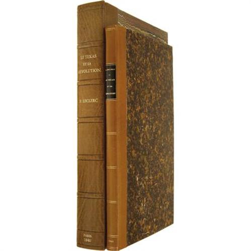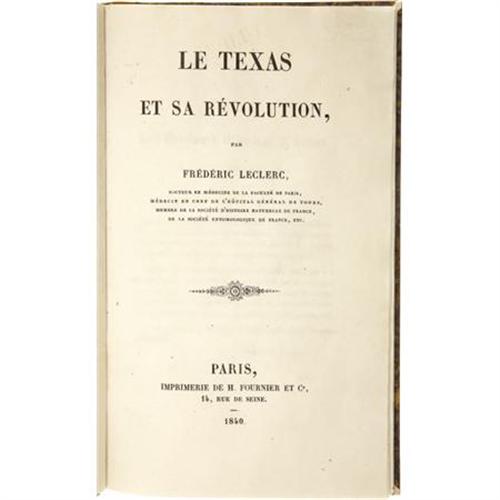 <B>Frederic LeClerc: </B></I><B><I>Le Texas et sa Revolution</B></I></B></I><B>.</B></I> (Paris: Imprimerie de H. Fournier et Ce., 1840). First edition. Octavo (8" x 5"). 104 pages. Folding map: <I>Carte du Texas</B></I>, (10.75" x 12.75"). LeClerc consulted Brue's excellent map of Texas as a starting point, and then augmented it with information garnered from his trip through Texas in 1838. The map also shows the new capital, Austin, and the village that became Waco. Quite a number of wagon roads are also identified throughout Texas. The book begins with a description of the rivers, including the Sabine, Brazos, and the Colorado, and leading communities of the Republic, including Houston, San Felipe de Austin, LaGrange, Bastrop, San Antonio, and Galveston. LeClerc covers Indian tribes of Texas, including a description of the Comanches. <BR><BR>Outlined in red and green, small tear on left side of map closed and repaired with no loss, book is fine. Housed in a quarter morocco clamshell case. Extremely rare, no copy is present in Streeter, in the Graff Collection at the Newberry, or in the Eberstadt catalog 162 on Texas; and no copy offered at auction in the past 30 years. Lacking in many major private and library collections.<I>From the collection of Darrel Brown.</B></I><BR><BR><B>Reference:</B></I> Streeter 1362. Howes L171. Raines, p. 137. Sabin 39652. <BR><BR><b>Shipping:</b> Books & Catalogs (<a target="_blank" href="http://www.heritageauctions.com/common/shipping.php">view shipping information</a>)