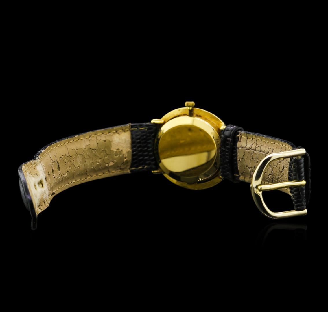 One LeCoultre vintage watch featuring: Case: 18KT yellow gold. Bezel: 18KT yellow gold. Dial: Light silver color; gold tone hands; gold tone stick index hour markers. Bracelet: Black leather with buckle clasp. Condition: The watch is in a vintage state; the bezel and band are extremely worn.