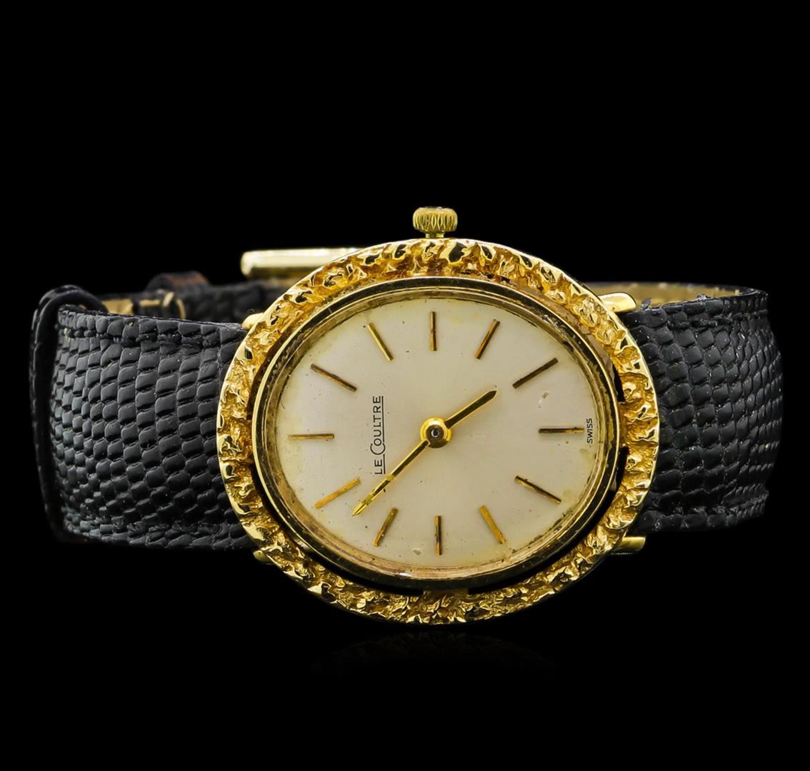 One LeCoultre vintage watch featuring: Case: 18KT yellow gold. Bezel: 18KT yellow gold. Dial: Light silver color; gold tone hands; gold tone stick index hour markers. Bracelet: Black leather with buckle clasp. Condition: The watch is in a vintage state; the bezel and band are extremely worn.