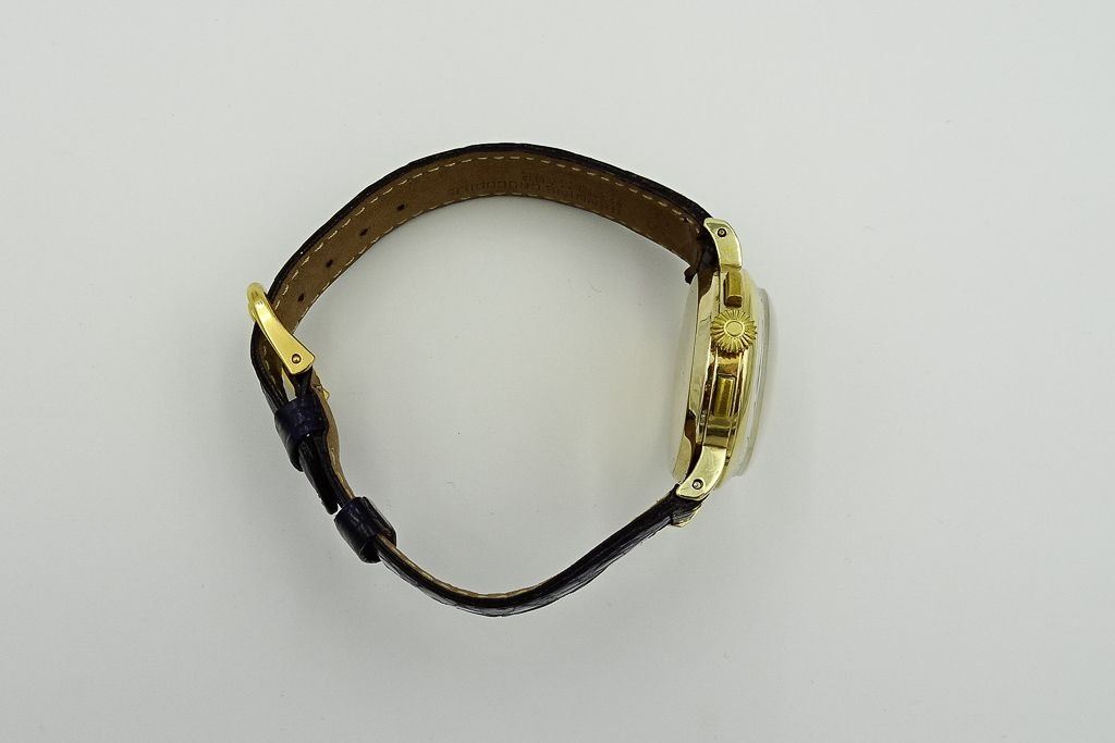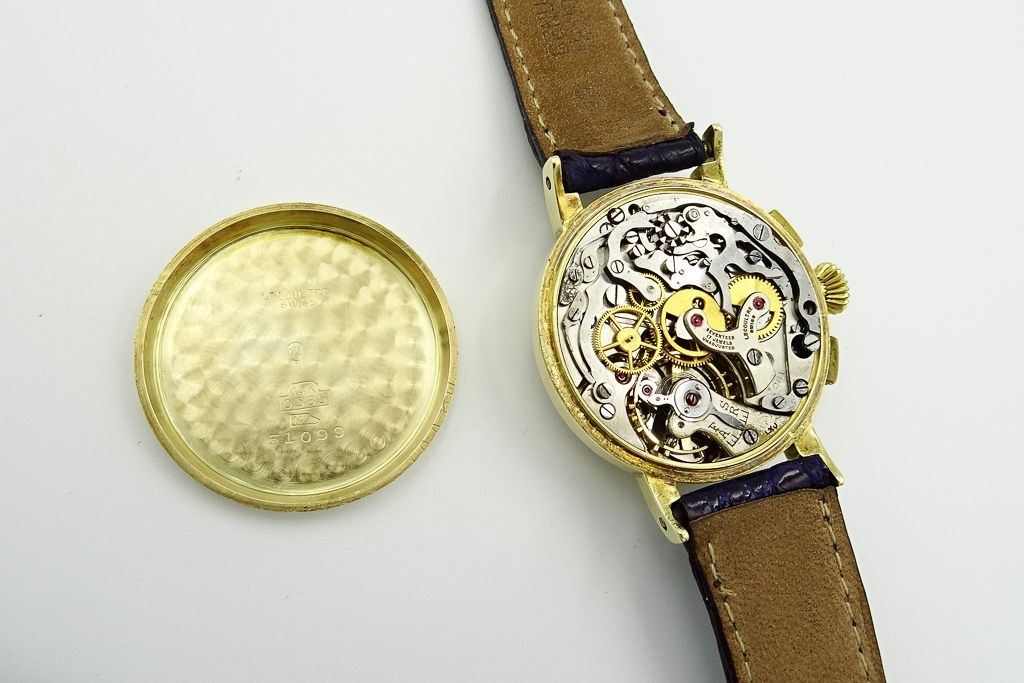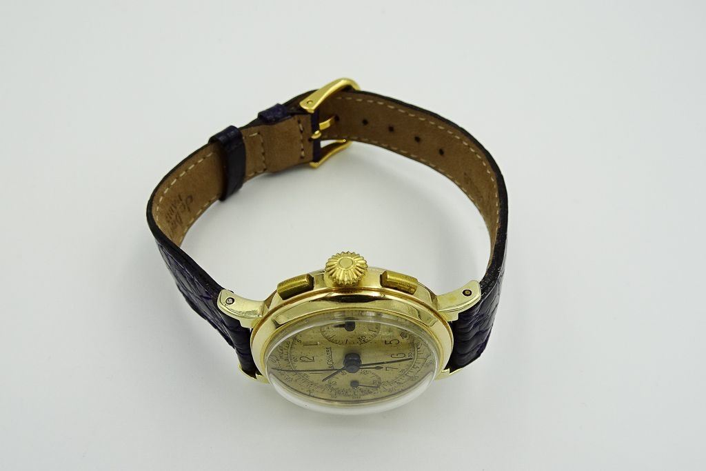 *These early tiny chronographs were based on the Universal Geneve platform which was shared by many watch companies. This combination of a fancy solid gold case and original untouched dial really works with this gem of a watch.