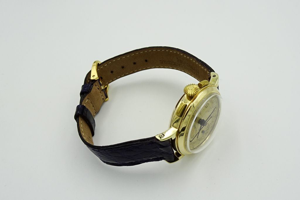 *These early tiny chronographs were based on the Universal Geneve platform which was shared by many watch companies. This combination of a fancy solid gold case and original untouched dial really works with this gem of a watch.