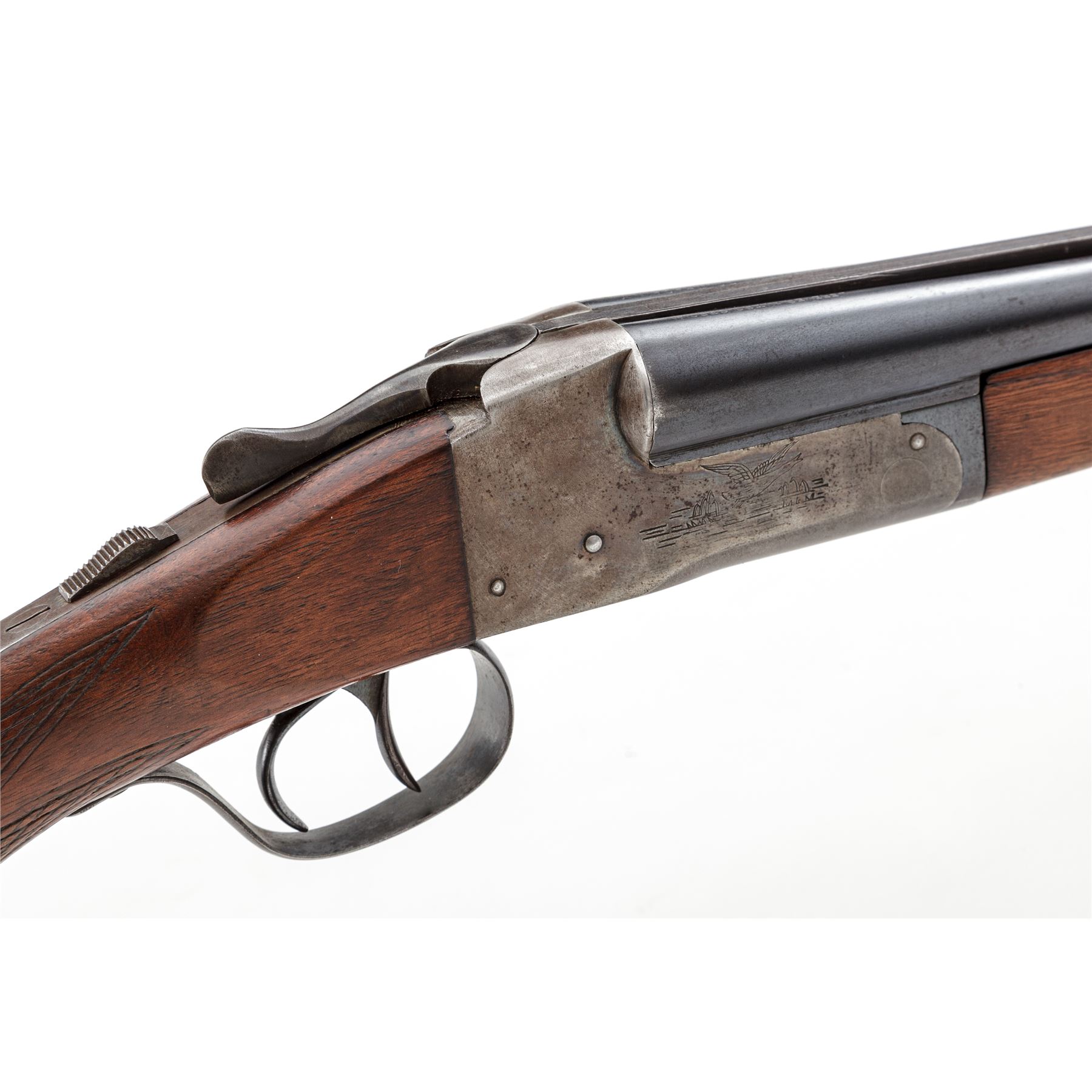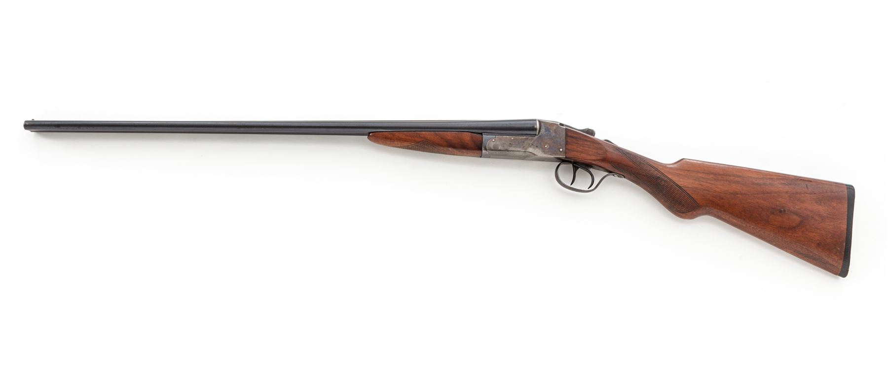 LeFever Nitro Special Side-by-Side Shotgun, #197131, .410 bore, 2-1/2'' chambers, 26'' serrated rib blue barrels choked Mod./Cyl., case hardened frame with simple roll engraved game scenes, double triggers, auto safety and extractors, pistol-grip checkered walnut stock and splinter forend, with factory hard rubber butt pad. Mfg'd 1925. Condition is fine. Barrels retain approx. 92% lightly thinning blue; frame shows approx. 65% case colors. Buttstock is excellent showing only light handling marks; forend with small loss to upper rear edge left side. Crisp action, bright bore. Est.: $2,000-$2,500. (C&R)