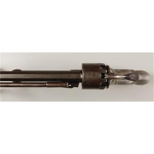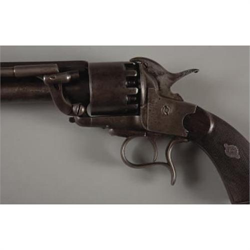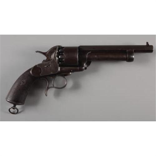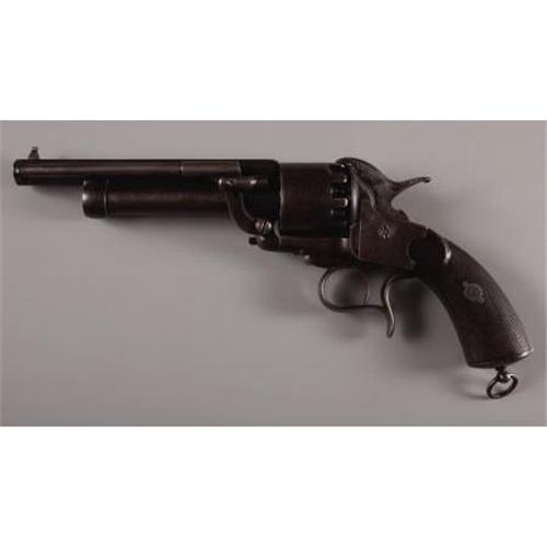 <B>EARLY TRANSITIONAL 1st/2nd </B></I> <B>MODEL .42/.63 CALIBER LEMAT PERCUSSION 10 SHOT REVOLVER SERIAL #3678 MATCHING EXCEPT LEVER.</B></I> The LeMat was a devastating Civil War period sidearm providing the user with both a 9 shot revolving cylinder and the added firepower of a 16 gauge shotgun barrel resulting in the nickname of “grape shot revolver.” They were much sought after and highly prized by Confederate officers with the most notable advocate being the Confederate cavalier Maj. Gen. J. E. B. Stuart. The vast majority of LeMat’s wartime production was shipped directly to the Confederacy. This particular example was probably manufactured and shipped in 1863. One of the most fascinating and sought after handguns used by the C. S. A. during the war, this being a very fine example.<BR><BR><B>Condition:</B></I> Barrel marking “Col. LeMat Bte S.C.D.C. Paris” inside a scroll edged panel in block letters, correct LM proof on the side of the barrel. All metal with dark smooth patina, very nice. Excellent bores, mechanically perfect. Checkered wood grip excellent with nice dark rich patina and scattered traces of varnish. Original lanyard ring on bottom of butt. The loading lever and plunger are extremely well made replacements and very difficult to detect, otherwise this rare secondary Confederate sidearm is complete and original in every respect.<BR><BR><b>Shipping:</b> Requires 3rd Party Shipping (<a target="_blank" href="http://www.heritageauctions.com/common/shipping.php">view shipping information</a>)