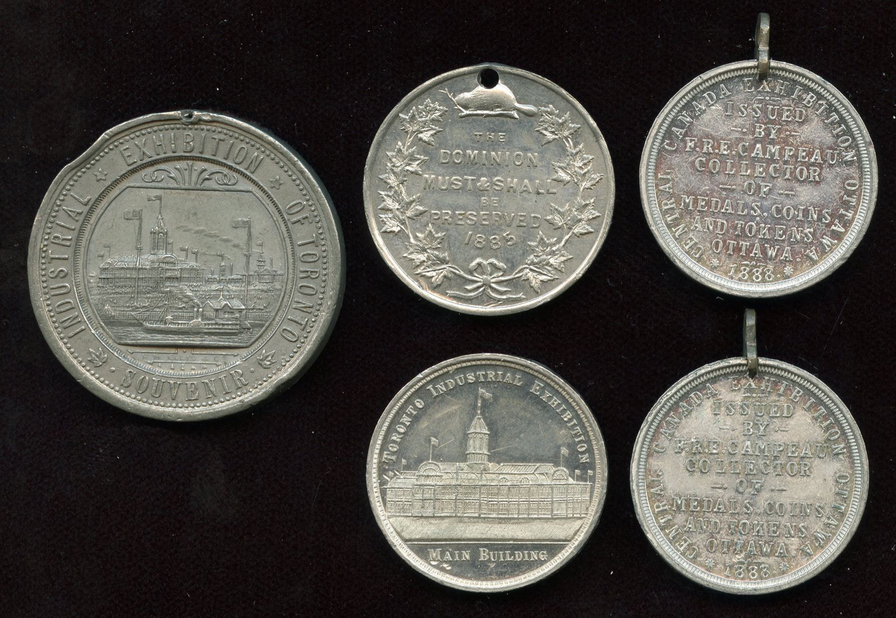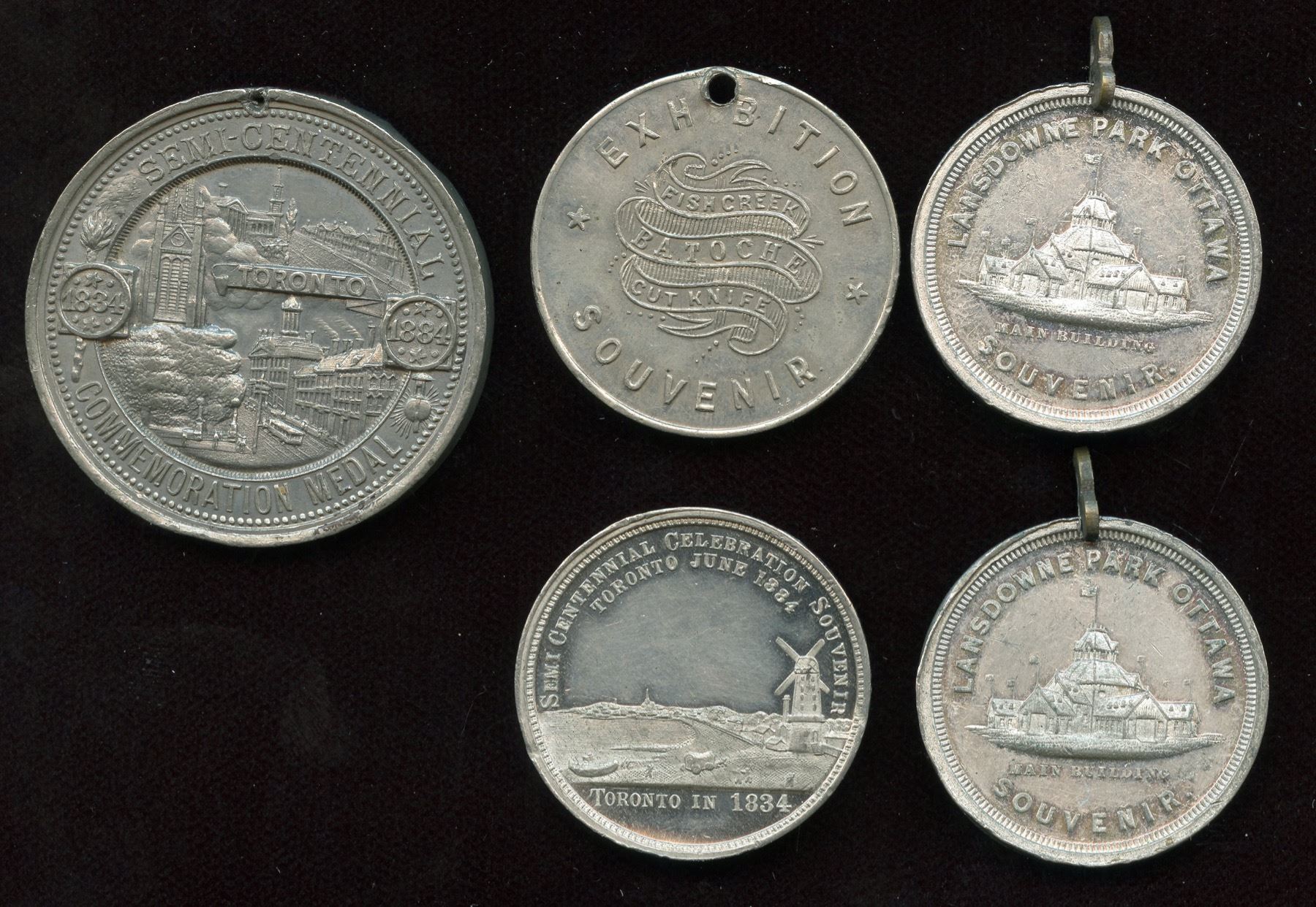 Ler 1508, Toronto Semi-Centennial, white metal with edge damage, VF; Ler 1510, Dominion Must be Preserved…., white metal, holed at top, UNC; Ler 1512a, Toronto Industrial exhibition, white metal, UNC; Ler 1513, Lansdowne Park Ottawa, white metal, UNC; another of the same only looped at the top ( 5 pcs)
