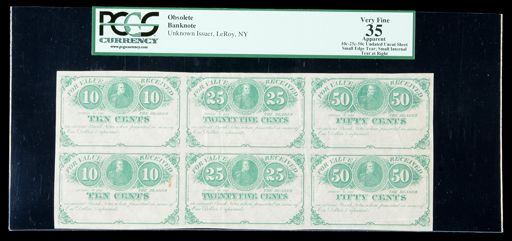 LeRoy, NY - Unknown Issuer Uncut Remainder Sheet of Six. 10-25-50¢ Undated. PCGS Very Fine 35 Apparent. Green inks and creamy paper were used for these notes. A small edge tear and a small internal tear at right are listed as the reasons for the Apparent grade.