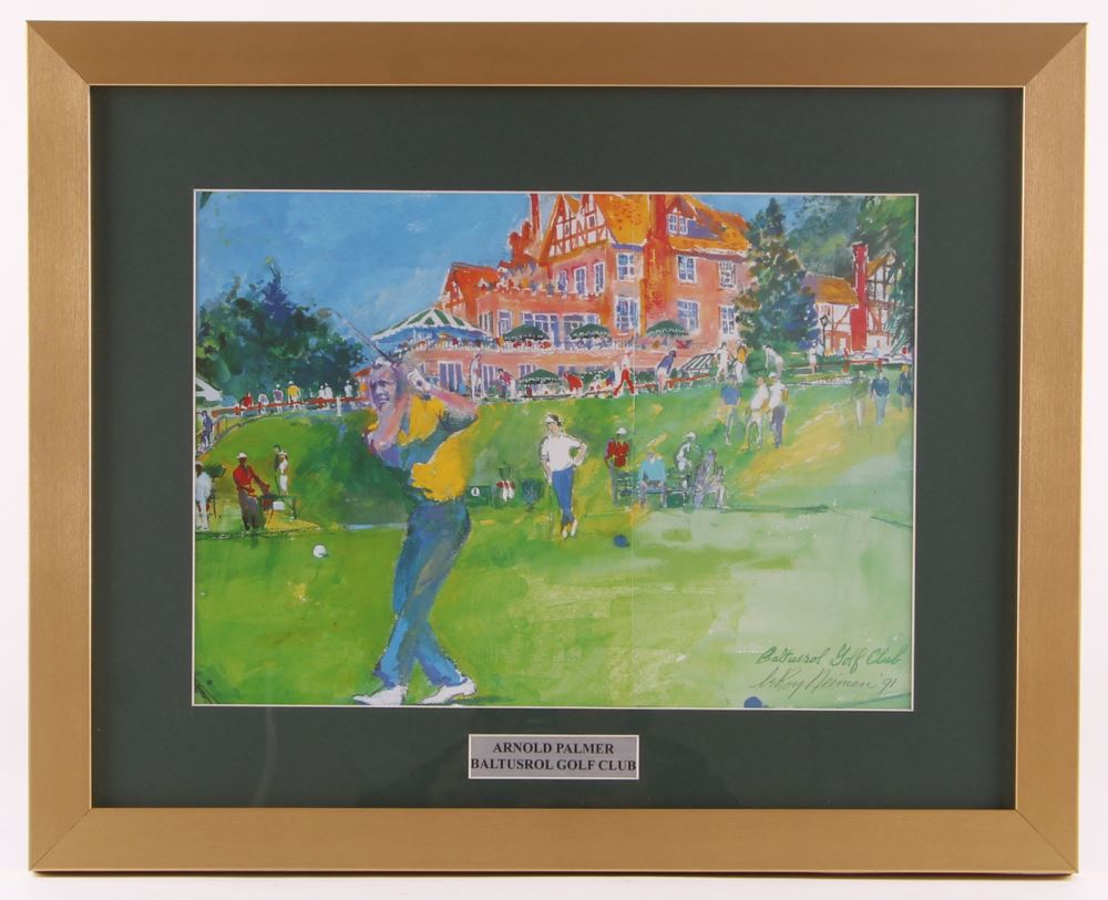 Custom framed print display measures 16" x 20" in size and features a print of Arnold Palmer from artist LeRoy Neiman (D. 2012). Please note, the display is made up of multiple prints and the signature is a facsimile.