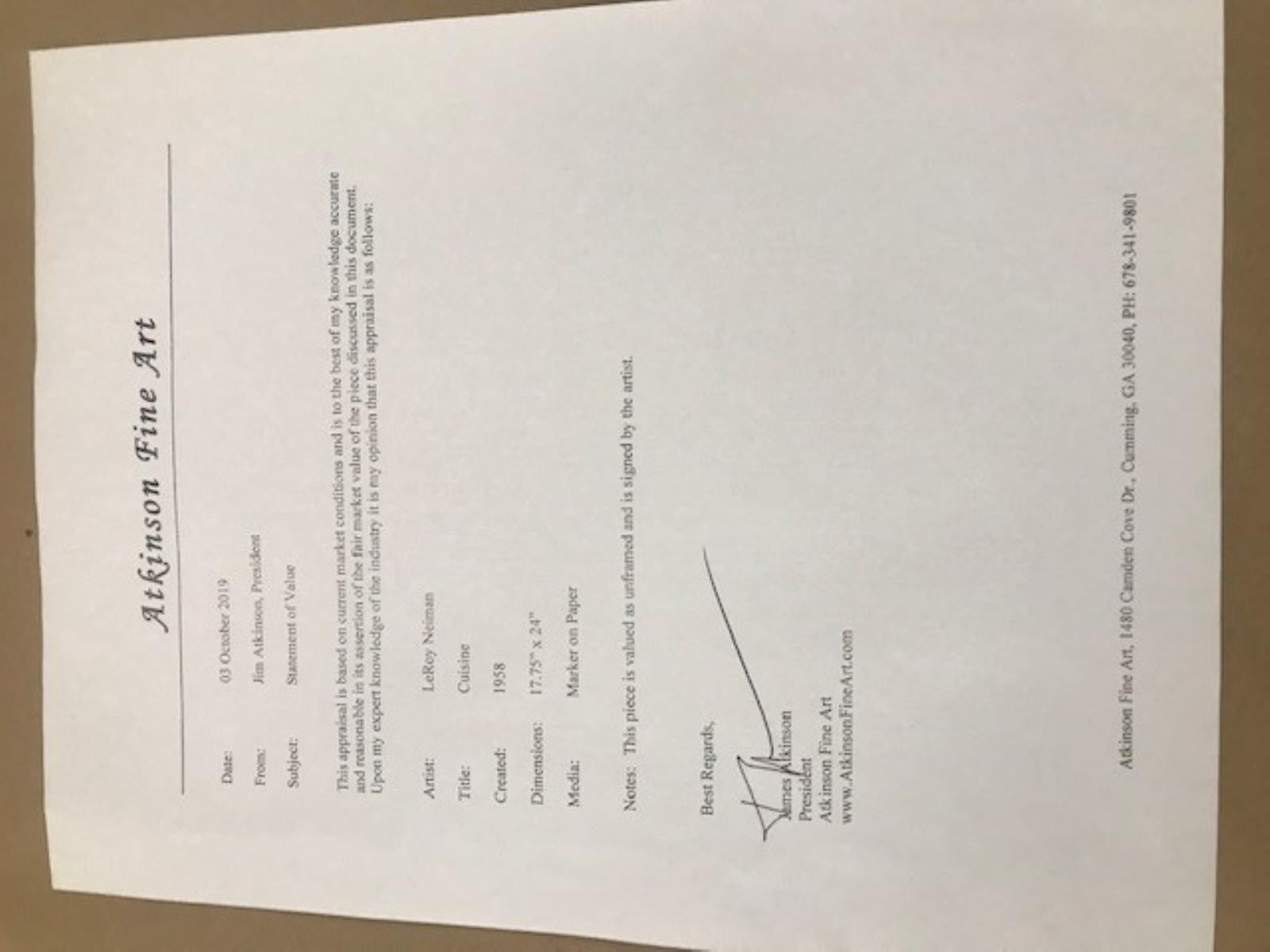 LeRoy Neiman "Cuisine" Original marker sketch on Paper signed by LeRoy Neiman - Circa 1958 - Framed size = 34"x26" - Includes Certificate of Authenticity