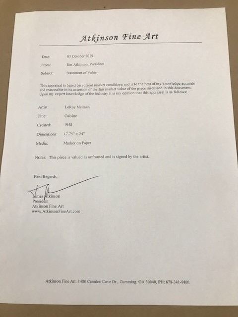 LeRoy Neiman "Cuisine" Original marker sketch on Paper signed by LeRoy Neiman - Circa 1958 - Framed size = 34"x26" - Includes Certificate of Authenticity