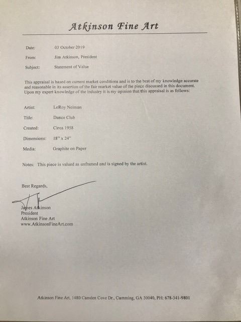 LeRoy Neiman "Dance Club" Original Graphite sketch on paper signed by LeRoy Neiman - Circa 1958 - Framed size = 34" x 28" - Includes Certificate of Authenticity