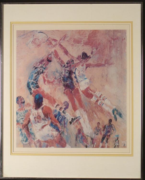 This Neiman print shows an exciting dunk by Dr. J., among some other amazing basketball greats. * Artist: LeRoy Neiman Title: Basketball Superstars Image size: 18 7/8 x 21 1/8 inches Framing: Triple matted in yellow and white, in chrome metal frame Frame size: 24 1/4 x 30 3/8 inches Condition: Excellent; frame could use some cleaning LeRoy Neiman is one of our most popular and prolific contemporary artists. His work consistently garners popular praise and critical acclaim. This is an exciting work by the man who has transformed "sports and celebrity art" into "fine art." *