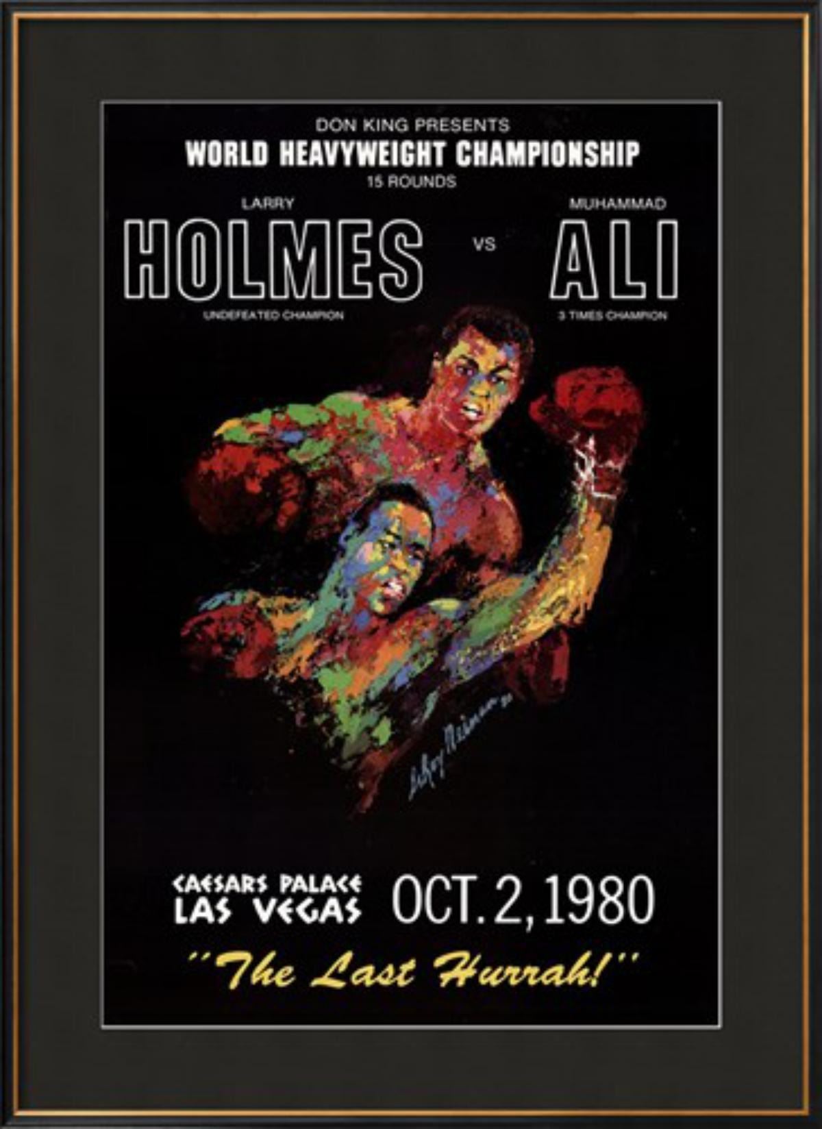 Artist: LeRoy Neiman. Medium: Lithograph. Title: Holmes vs. Ali. Size: 32 x 44 inch. "The Last Hurrah" was the 2nd to last fight of Muhammad ali, in which he was defeated by Holmes.. Published in 1980. Condition B- (good condition, signs of handling and age).