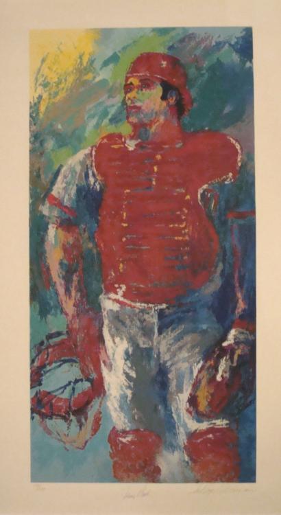 In this colorful portrait, a proud Johnny Bench stands, looking off into the field, the intensity of the moment captured beautifully. This print is the best you can find, because it is signed by both the artist and the star catcher. * Artist: LeRoy Neiman Title: "Johnny Bench, The Catcher" Medium: Serigraph on paper Signatures: In pencil, lower right, and lower center Edition: Limited, numbered 139/250 in pencil, lower left Sheet size: 25 x 44 1/2 inches Image size: 19 x 38 inches Condition: Excellent Includes: Certificate of Authenticity from Knoedler Publishing, and two printed photo images of Bench at the signing LeRoy Neiman is one of our most popular and prolific contemporary artists. His work consistently garners popular praise and critical acclaim. This is an exciting work by the man who has transformed "sports and celebrity art" into "fine art." *