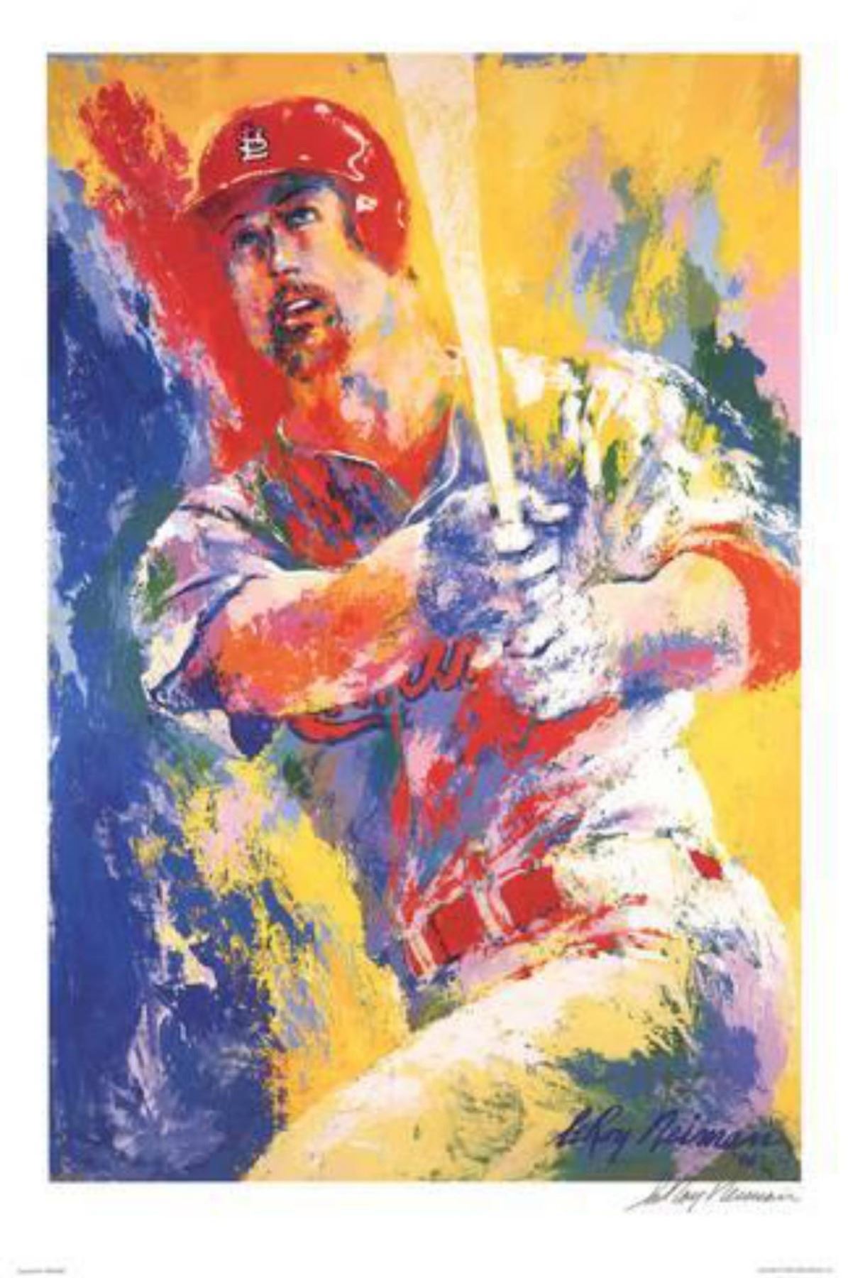 Artist: LeRoy Neiman. Medium: Lithograph. Title: Mark McGwire. Hand signed in black pen, unnumbered. Text on the reverse states "This posters is limited to 5,000 reproductions and is unnumbered.". Published in 1999. Certificate of authenticity is included. Condition B (very good condition, with signs of handling or age). Size: 24 x 36 in.