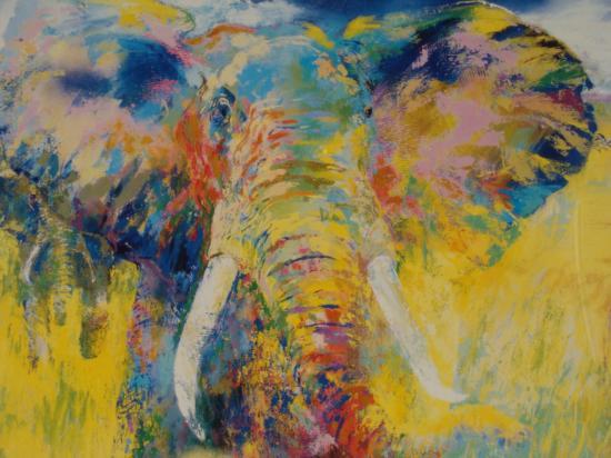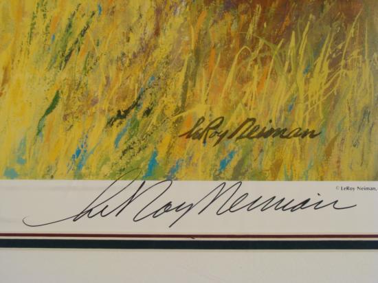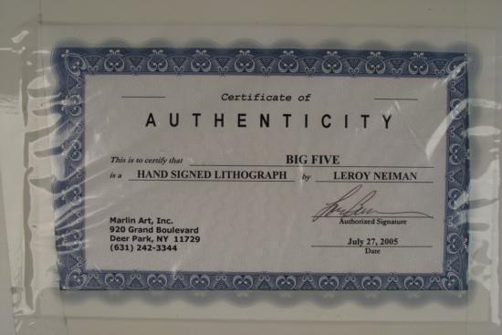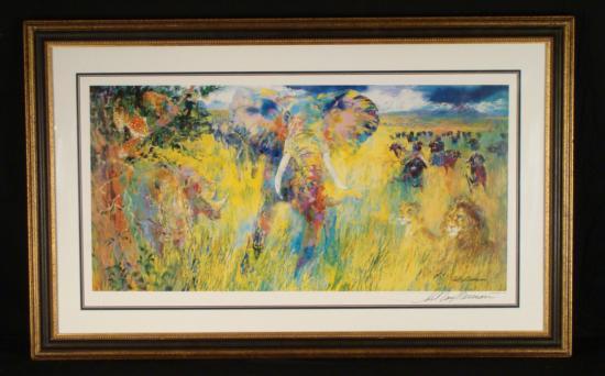 This print was hand signed by legendary artist LeRoy Neiman. Five big game animals are portrayed in this fantastic safari scene. Neiman's bright colors are perfectly suited to the untamed African plains, with a collage effect, and a vastness that stretches to the mountain range looming over the horizon. Artist: LeRoy Neiman Title: "Big 5" Medium: Lithograph print Signature: "LeRoy Neiman" by the artist in black Sharpie, underneath signature in the plate Image size: 21" x 38" Frame size: 30" x 48" Framing: Custom framed, triple matted in white, maroon, and dark green; black and gold painted decorative wood frame with speckled pattern Condition: Excellent; some light wear to the frame, and scuff marks to the Plexiglass Certificate of Authenticity: from Marlin Art, Inc. The size of this piece helps convey the expansiveness of the wild plains, and the immense power of the animals that live there. Neiman has certainly captured the wildness, in form and color. This is an incredible signed print from an enormous artistic talent. Biography:LeRoy Neiman (1926- ) LeRoy Neiman was born in St. Paul, Minnesota, and studied at the Art Institute of Chicago, De Paul University, and the University of Illinois. He taught at the Art Institute of Chicago's school for ten years. Neiman moved to New York City in 1963 when he had his first one-man show at the Hammer Gallery. Since then he has continued to portray the people and events of the world he knows best, or which intrigue him most. His best-known works are sports scenes, a reflection, he believes, of the fact that sports are universally a dominant force. He was the official artist for ABC-TV at the Olympic Games in 1972 and 1976, and at the Winter Olympics of 1980. Neiman's work has been exhibited in galleries and museums throughout the world, including the Smithsonian Institution in Washington, D.C., and the Hermitage in Leningrad.
