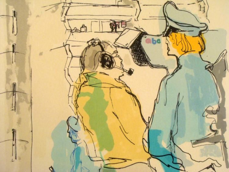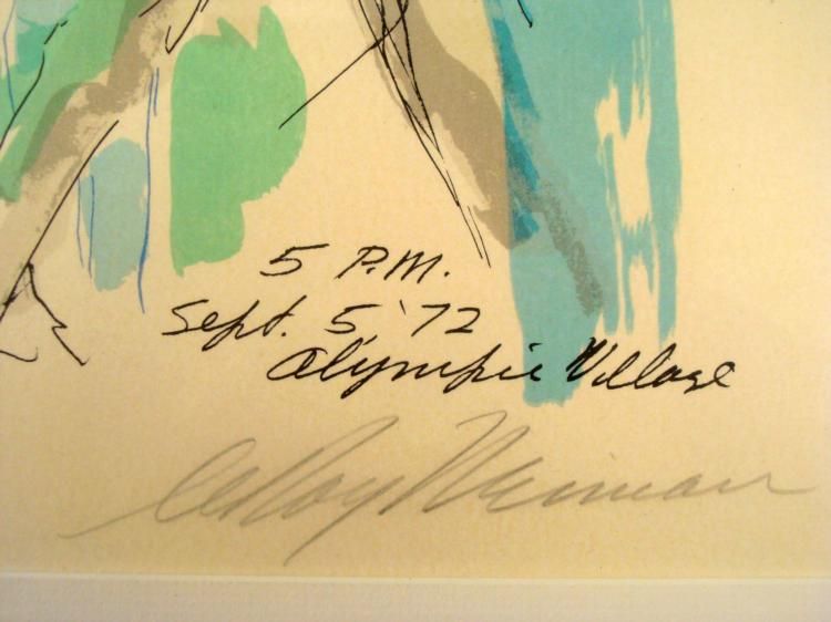 This signed Neiman print shows the aftermath of the attack on the dormitories at the Munich Olympic Village in1972. Neiman proved himself to be a true artist of contemporary culture in his portrayal of this event that shook the world. * Artist: LeRoy NeimanSignature: In pencil, lower right Title: Sept. 5th, 5 P.M.Edition: Artist's Proof, marked AP, lower leftMedium: Serigraph on paperImage size: 14 x 18 inchesFraming: Matted in white, with chrome metal frameFrame size: 20 1/4 x 24 1/4 inchesCondition: ExcellentBiography: * LeRoy Neiman is one of our most popular and prolific contemporary artists. His work consistently garners popular praise and critical acclaim. He transformed "sports art" into "fine art." </P> *