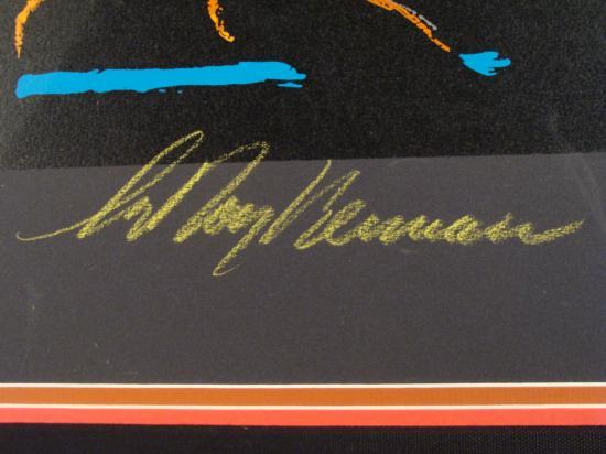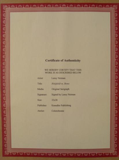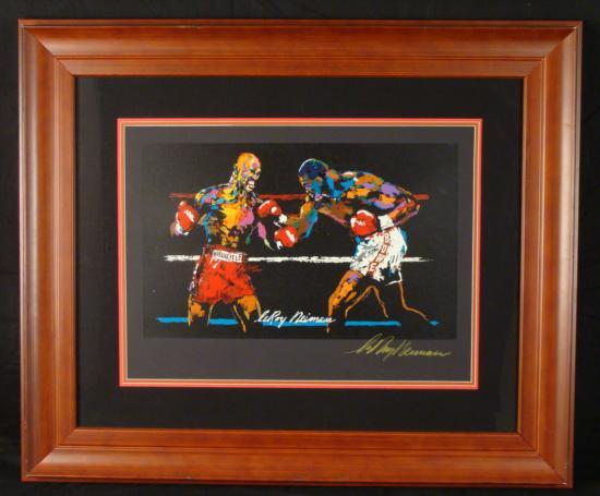 This original serigraph was hand signed by legendary artist LeRoy Neiman. It shows an action scene in an exciting boxing match between Evander Holyfield and Riddick Bowe. The colors convey the intense emotions experienced in the heat of the fight. Artist: LeRoy Neiman Title: "Holyfield vs. Bowe" Medium: Serigraph print Publisher: Knoedler Publishing Atelier: Colorchrome Signature: "LeRoy Neiman" by the artist in in gold paint pen, lower right; also signed in the plate Image size: 17" x 23" Frame size: 31" x 37" Framing: Custom framed, triple matted in red and brown matte board, and black fabric; red tone wood frame Condition: Excellent; some very light wear to the frame corners Certificate of Authenticity: Included Holyfield and Bowe have certainly had some memorable bouts, and Neiman has captured the raw intensity and emotion of their battle in the ring. Biography: LeRoy Neiman (1926- ) LeRoy Neiman was born in St. Paul, Minnesota, and studied at the Art Institute of Chicago, De Paul University, and the University of Illinois. He taught at the Art Institute of Chicago's school for ten years. Neiman moved to New York City in 1963 when he had his first one-man show at the Hammer Gallery. Since then he has continued to portray the people and events of the world he knows best, or which intrigue him most. His best-known works are sports scenes, a reflection, he believes, of the fact that sports are universally a dominant force. He was the official artist for ABC-TV at the Olympic Games in 1972 and 1976, and at the Winter Olympics of 1980. Neiman's work has been exhibited in galleries and museums throughout the world, including the Smithsonian Institution in Washington, D.C., and the Hermitage in Leningrad. *