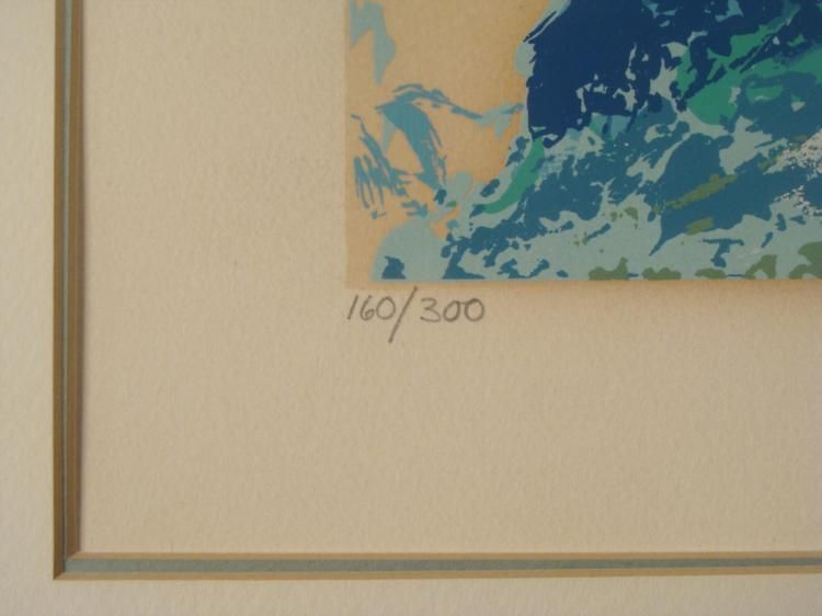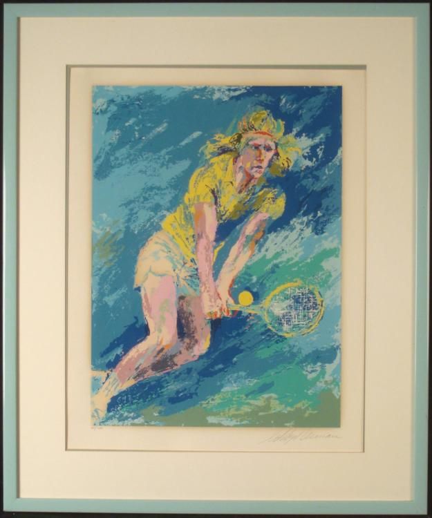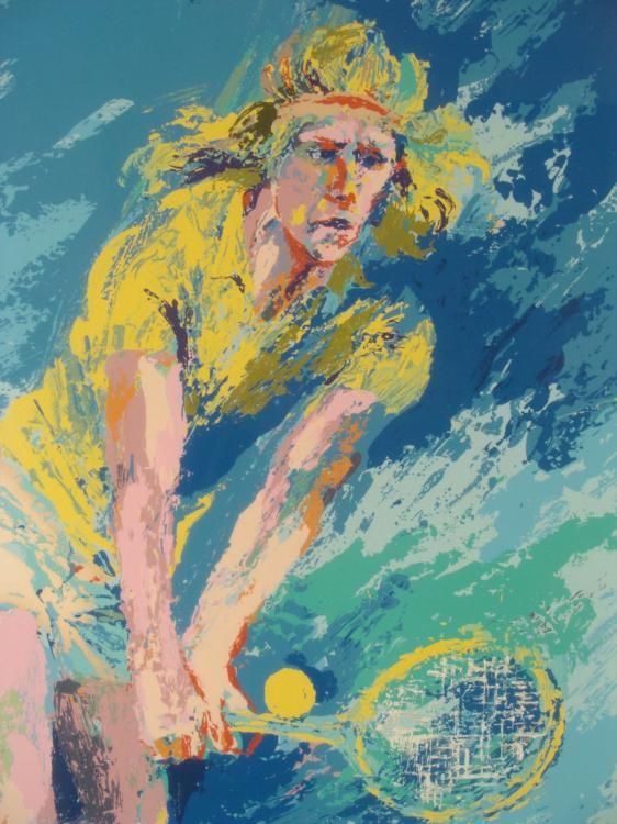 This limited edition Neiman print portrays the Swedish tennis star Bjorn Borg, his vibrant yellow hair and shirt emphasizing his lightning speed on the court. * Artist: LeRoy NeimanSignature: In pencil, lower right marginTitle: Bjorn BorgMedium: SerigraphEdition: Numbered 160/300, in pencil lower leftImage size: 17 1/4 x 23 1/2 inchesFraming: Double matted in blue and white, in light blue laminate frame Frame size: 29 1/2 x 35 1/2 inchesCondition: Excellent; frame has some surface nicks, and matting is slighly askew, and needs to be re-alignedLeRoy Neiman is one of our most popular and prolific contemporary artists. His work consistently garners popular praise and critical acclaim. This is an exciting work by the man who has transformed "sports and celebrity art" into "fine art." *