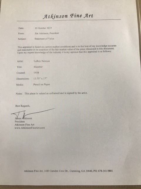 LeRoy Neiman "Slumber" Original pencil sketch on Paper signed by LeRoy Neiman - Circa 1958 - Framed size = 26" x 29" - Includes Certificate of Authenticity