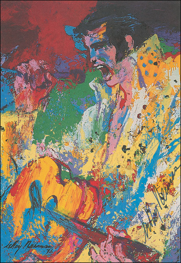 Color book print of Neiman’s portrait of Elvis Presley singing into a microphone, 7.5 x 10.75, signed in blue felt tip by Neiman. In fine condition.