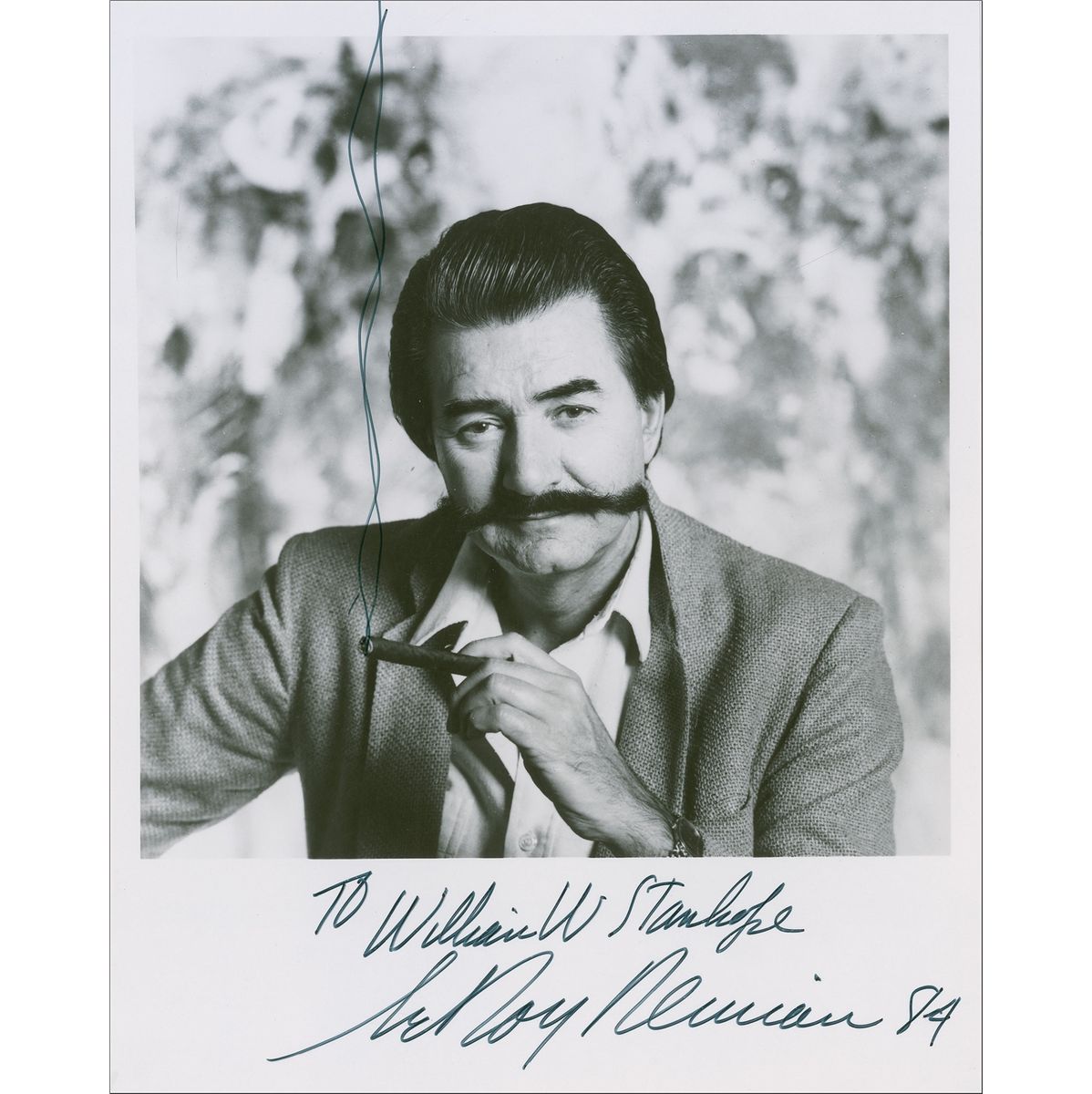 Glossy 8 x 10 photo of Neiman holding a cigar, signed and inscribed in the lower border in black felt tip “To William W. Stanhope, LeRoy Neiman 84,” adding a couple of smoke tendrils to his cigar. Very fine condition.