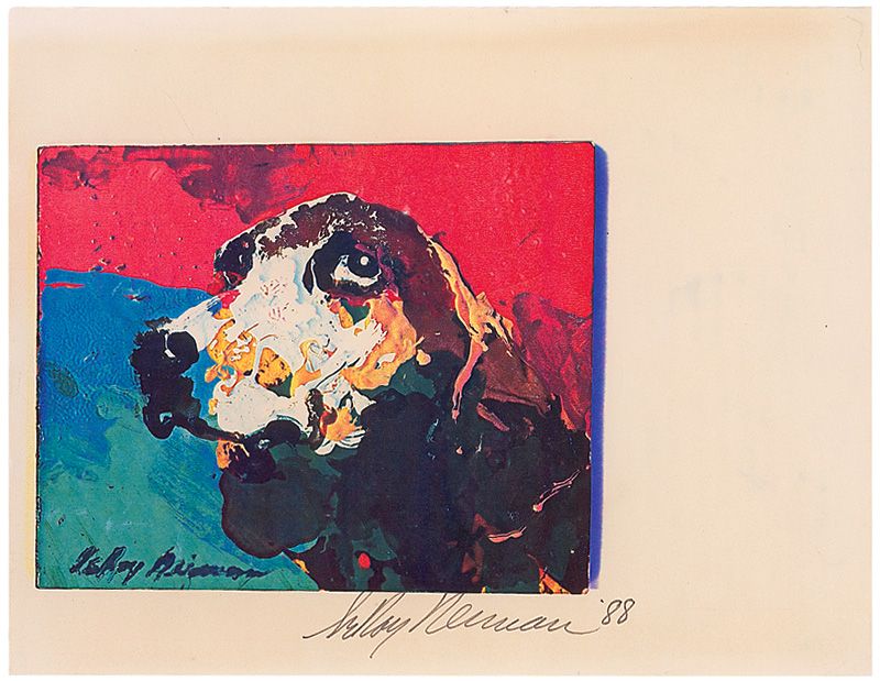 Color 11 x 8.5 print of a hound dog, signed in the lower border in black felt tip, “LeRoy Neiman ‘88.” In fine condition, with scattered light creases and wrinkles and a uniform block of mild toning.