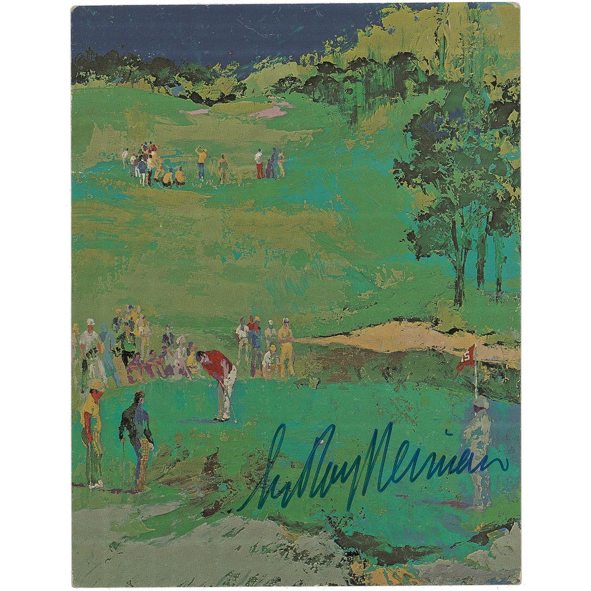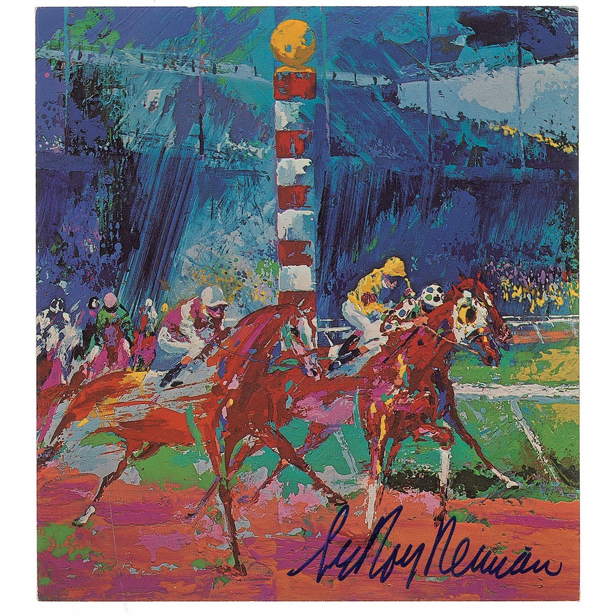Two color postcard photos of Neiman’s works, 5.5 x 6 and 5.5 x 7, each signed in felt tip. In overall fine condition, with trimmed edges to the horse racing photo.