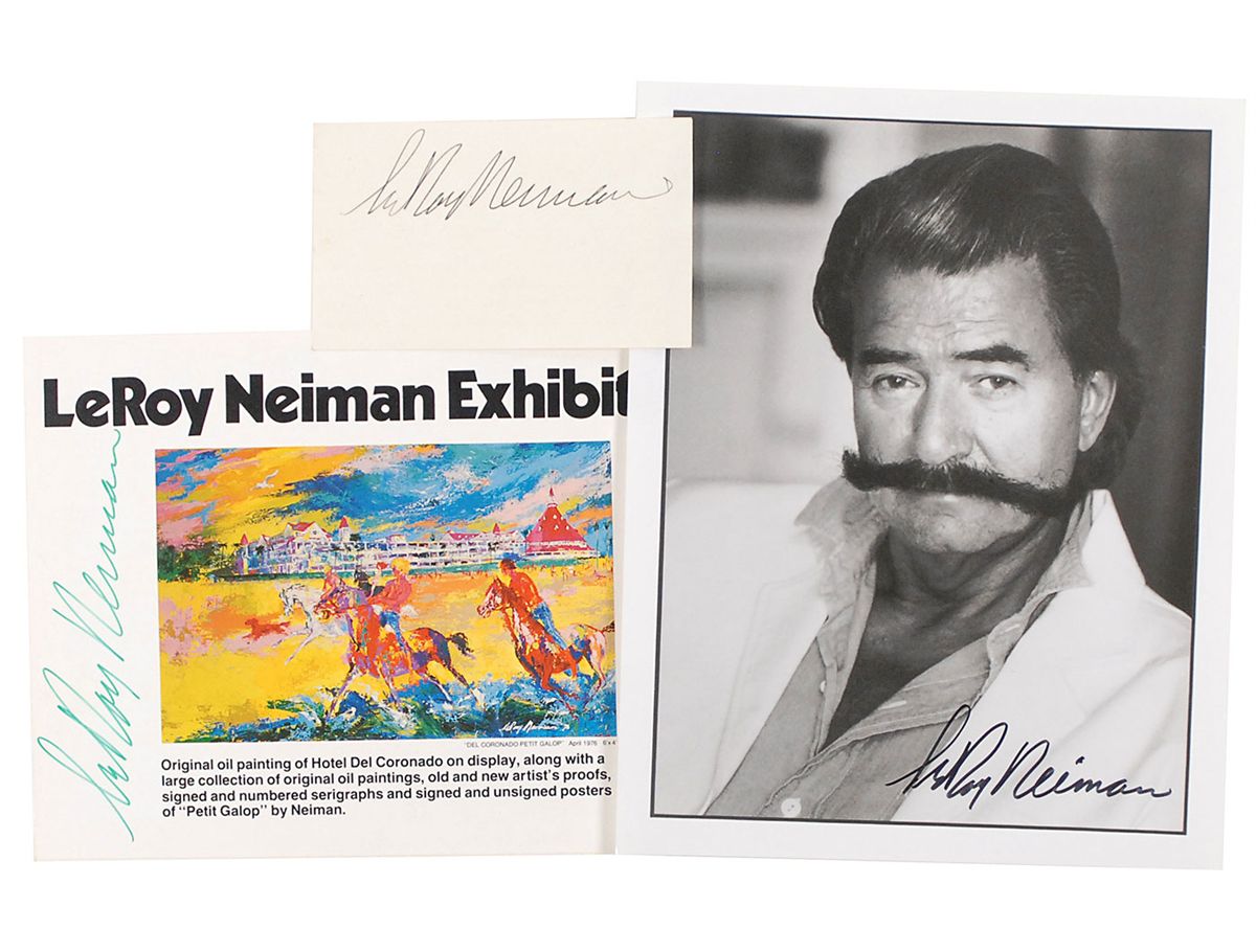 Three items: glossy 8 x 10 photo of Neiman sporting his handlebar mustache, signed in black felt tip; exhibition booklet featuring a color image of his painting of Hotel Del Coronado, 9.5 x 7, vertically signed in the left border in green felt tip; and a felt tip signature on an off-white 5 x 3 card. In overall fine condition.
