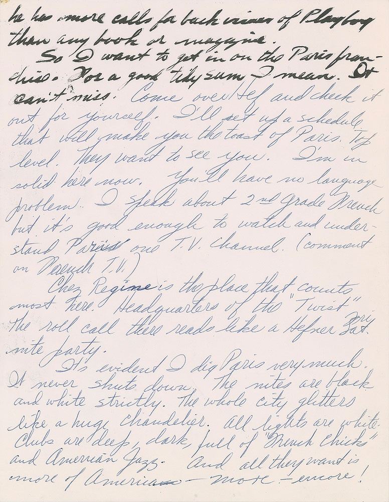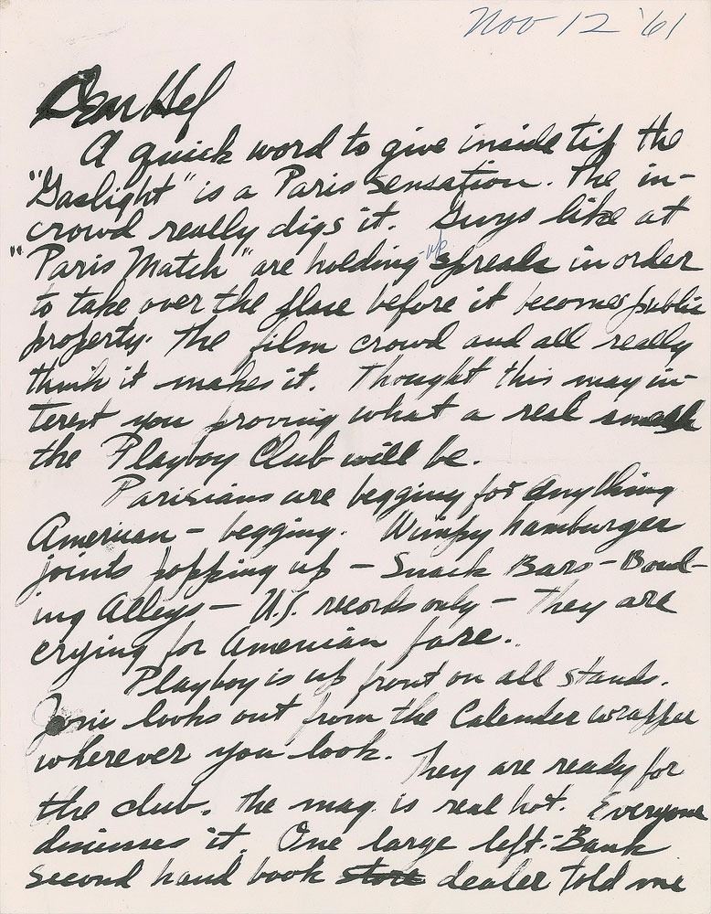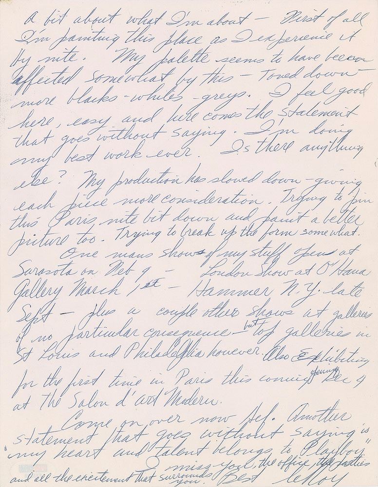 ALS signed “LeRoy,” three pages, penned in black ink and ballpoint, 8.25 x 10.5, November 12, 1961. Letter to Playboy founder and publisher Hugh Hefner, in part: "A quick word to give inside tip the ‘Gaslight’ is a Paris sensation. The in-crowd really digs it. Guys like at ‘Paris Match’ are holding up spreads in order to take over the place before it becomes public property. The film crowd and all really think it makes it. Thought this may interest you providing what a real smash the Playboy Club will be. Parisians are begging for anything American—begging. Wimpy hamburger joints popping up—Snack Bars—Bowling Alleys—U.S. records only—they are crying for American fare. Playboy is up front on all stands. Joni looks out from the calendar wrapper wherever you look. They are ready for the club. The mag is real hot. Everyone discusses it. One large left-bank second hand book dealer told me he has more calls for back issues of Playboy than any book or magazine…It’s evident I dig Paris very much. It never shuts down. The nites are black and white strictly. The whole city glitters like a huge chandelier. All lights are whiter. Clubs are deep, dark, full of ‘French chicks’ and American Jazz. And all they want is more of America–More–encore!…I’m painting this place as I experience it by nite. My palette seems to have been affected somewhat by this—toned down—more blacks–whites–greys. I feel good here, easy and here comes the statement that goes without saying. I’m doing my best work ever…One man show of my stuff opens at Sarasota on Feb 9—London Show at O’Hara Gallery March 1st—Hammer N.Y. late Sept—plus a couple other shows at galleries of no particular consequence but top galleries in St. Louis and Philadelphia however. Also exhibiting for the first time in Paris this coming opening Dec 4 at the Salon d’art Modern. Come on over now Hef. Another statement that goes without saying is ‘my heart and talent belongs to Playboy.’” In fine condition. Accompanied by a certificate of authenticity from PSA/DNA. Around 1954, Neiman first met the Playboy mogul while doing freelance fashion illustration for the Carson Pirie Scott department store chain, where Hefner was employed as a writer. Hefner later hired Neiman as a contributor to Playboy, a position he held for 50 years; Neiman famously created the Femlin character for the Party Jokes page, as well as the ‘Man at His Leisure’ feature.