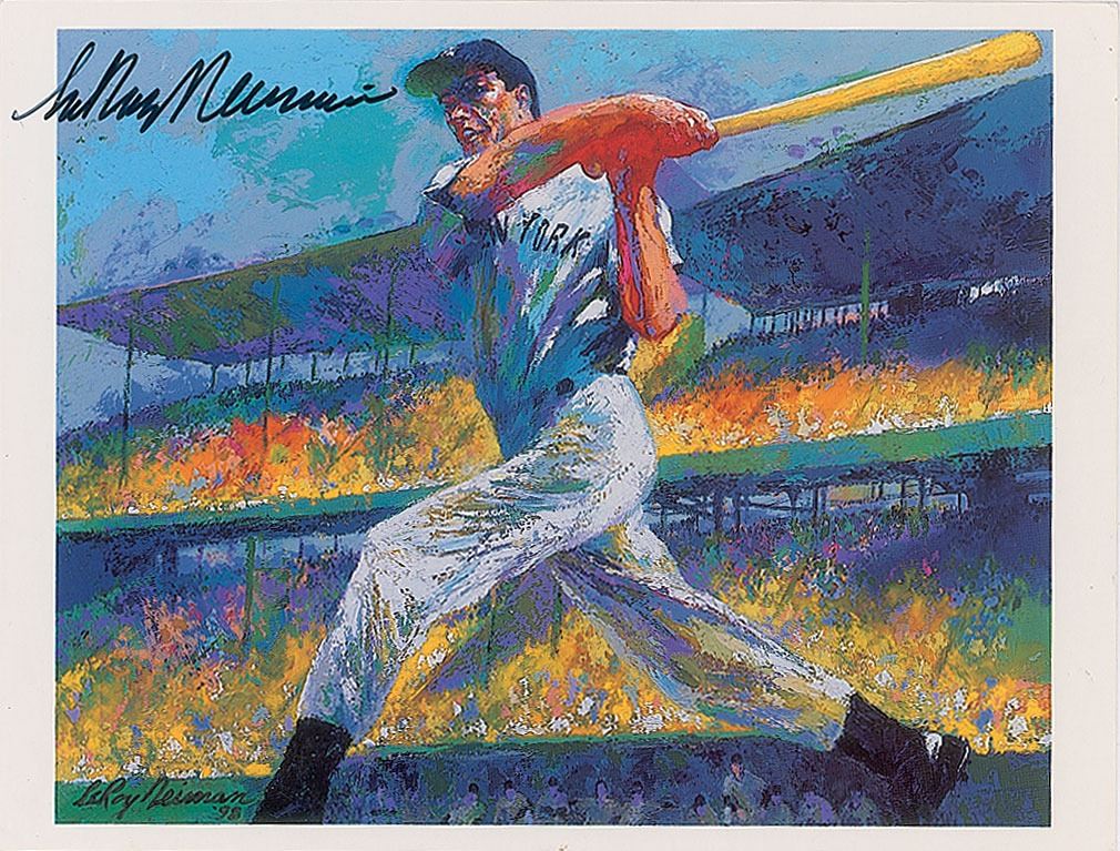 Attractive color 7.25 x 5.5 postcard featuring an image of LeRoy Neiman's serigraph 'The DiMaggio Cut,' signed in black felt tip by the artist. In fine condition.