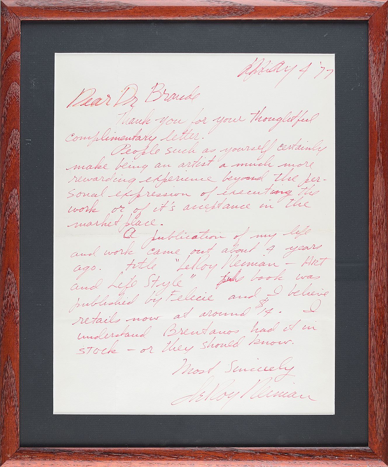 ALS in red crayon, one page, 10.5 x 13.5, May 4, 1977. Letter to Dr. Brande, in full: "Thank you for your thoughtful complimentary letter. People such as yourself certainly make being an artist a much more rewarding experience beyond the personal expression of executing the work or of its acceptance in the market place. A publication of my life and work came out about 4 years ago. Title 'LeRoy Neiman—Art and Life Style' the book was published by Felicie and I believe retails now at around $14. I understand Brentanos had it in stock—or they should know." Matted and framed to an overall size of 14.75 x 17.75. In fine condition.
