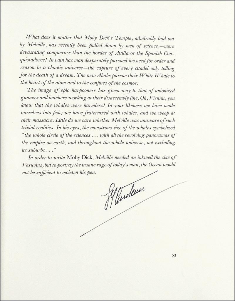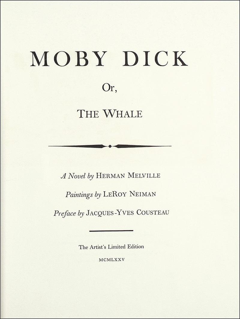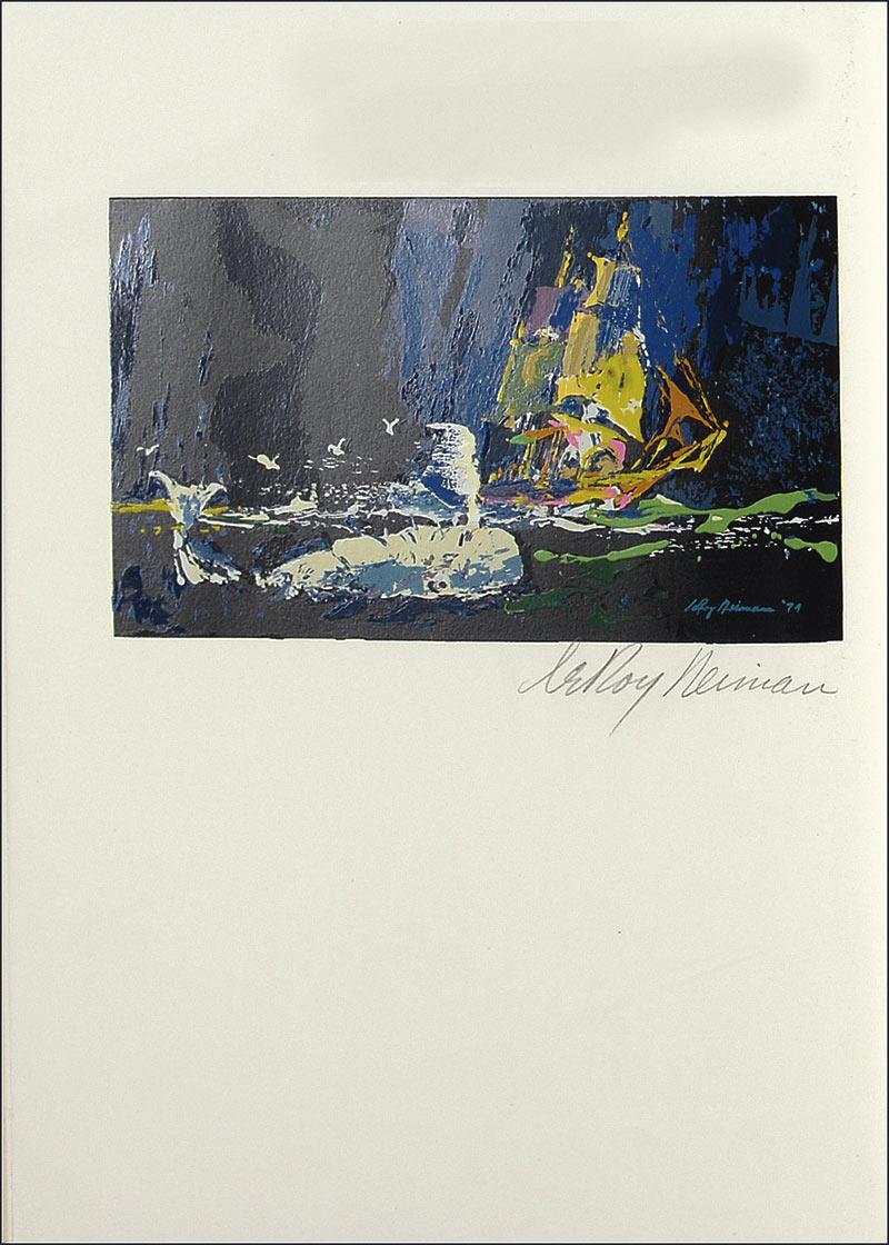 Signed book: Herman Melville: Moby Dick, or the Whale. Artist’s limited edition of 1500 copies (this copy No. 104). Mount Vernon, New York: A. Colish, 1975. Gilt-stamped, leather-bound hardcover with slipcase, 11.5 x 14.25, 272 pages. Signed in pencil on the frontispiece, which bears a beautiful color serigraph by Neiman. Book also bears a preface signed by Jacques Cousteau. In fine condition, with a bit of scattered light surface wear to cover. Pre-certified PSA/DNA and RRAuction COA.