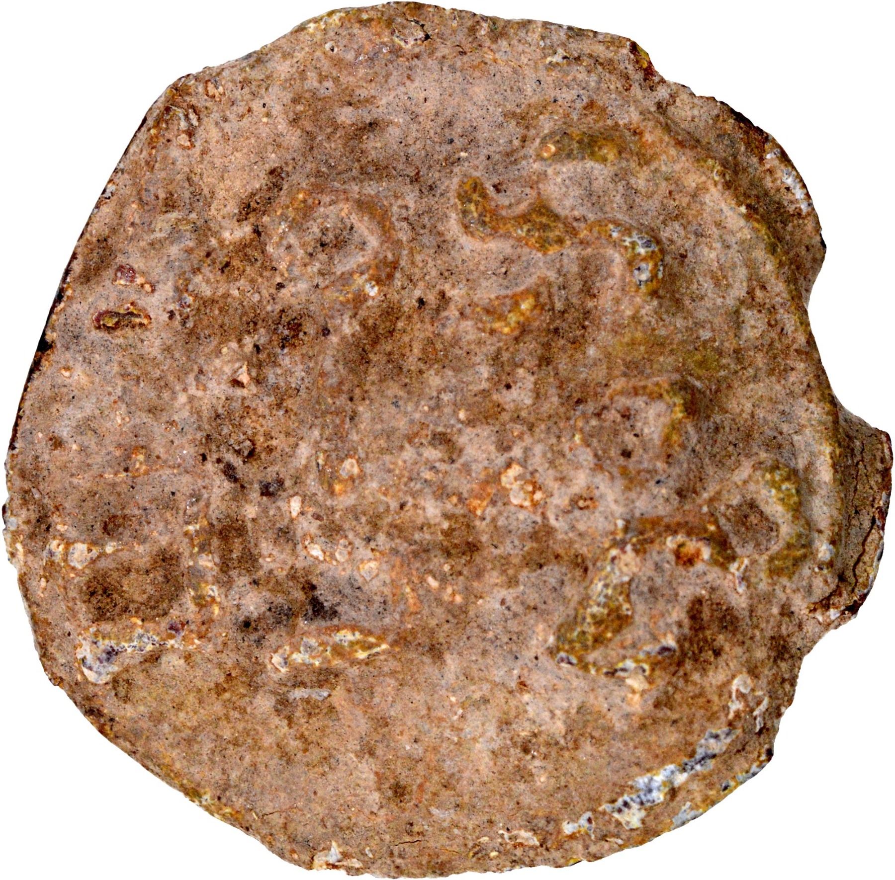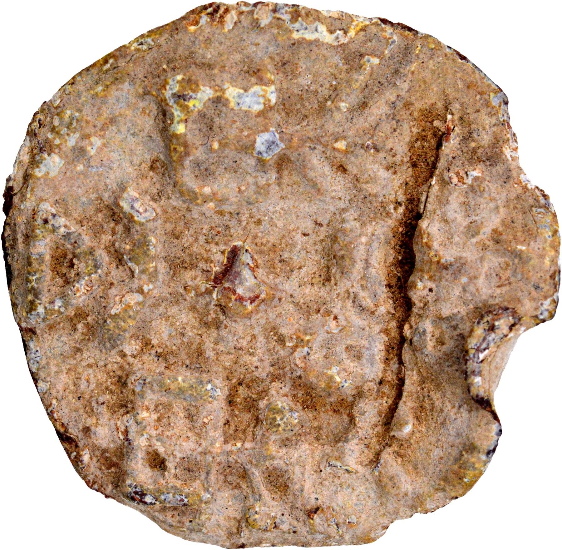 City State of Erikachha (300-200 BC), Dasharna area, Betwa River, Lead Unit, Obv: the Brahmi legend "Erikacha" between two horizontally placed trees within railings and an Ujjaini symbol in the right field, Rev: a pole with a circular end within railings in the center, a tree within railings in the left field, a Swastika and an Ujjaini symbol in the right field, 6.05g, 19.69mm, (Variant of W. Pieper # 514), choice extremely fine, Rare.