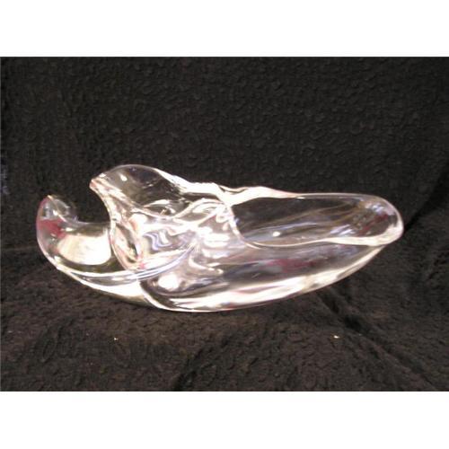 This vase lays on its side and sprawls on the table. Unsual piece that catches the light and would certainly be a wonderful addition to any collection.