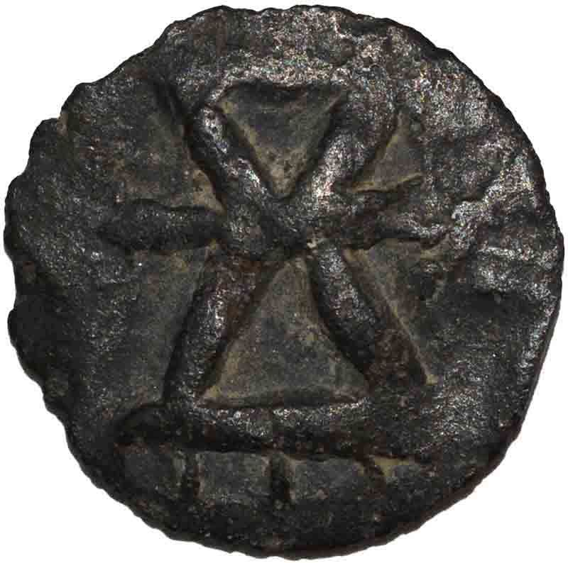 Anandas of Karwar, Chutukulanandas, Chutus Fractional Lead Unit, Obv: nandipada, Rev: damaru symbol, 1.80g, 15.69mm, about very fine.