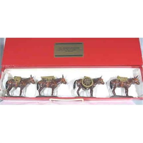 Four lead mules each weighing 4.6oz. Each carrying a different load. Not marked with a makers name.The Box is included although it is not the original box.