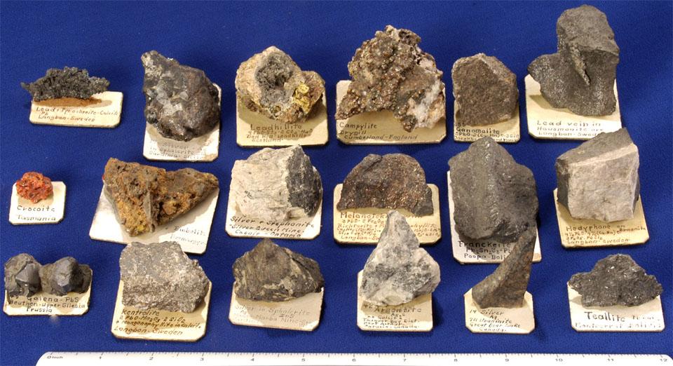 Lot of 25 specimens from North America, South America, and Western Europe. 1.) Argentite hosted in calcite, Thunder Bay District, Port Arthur, Ontario, Canada. 4 x 3 x 5 cm. 2.) Silver with uraninite, Great Bear Lake, Canada. 2 x 1 x 6 cm. 3.) Leadhillite, Dod Hill, Leadhills, Scotland. 5 x 4 x 3 cm. 4.) Pyrochroite with calcite, Langban, Sweden. 4 x 1 x 2 cm. 4.) Melanotekite with richterite and manganophyllite, Langban, Sweden. 5 x 2 x 3 cm. 5.) Campylite with unique botryoidal habit, Drygill, Cumberland, England. 6 x 5 x 4 cm. 6.) Massive stephanite, Silver Queen Mine, Cobalt, Ontario, Canada. 5 x 3 x 4 cm. 7.) Galena with minor sphalerite and calcite, Sardinia, Sicily. 4 x 5 x 3 cm. 8.) Crystalline bournonite, Cornwall, England. 2 x 1 x 1 cm. 9.) Crystalline gratonite, Cerro de Pasco, Peru. 2 x 1 x 1 cm. 10.) 2 specimens of octahedral galena, Beuthen, Upper Silesia, Prussia. 2 x 2 x 2 cm. 11.) Massive franckeite, Poopa, Bolivia. 5 x 4 x 2 cm. 12.) Ganomalite hosted in granite, Nordmark, Sweden. 3 x 1 x 5 cm. 13.) Kentrolite with manganophyllite and minor calcite, Langban, Sweden. 4 x 2 x 3 cm. 14.) Lead vein in housmanite ore, Langban, Sweden. 4 x 3 x 6 cm. 15.) Galena and sphalerite hosted in dolomite, Monte Marba Mine, San Vito, Sardina. 4 x 2 x 4 cm. 16.) Hedyphane with braunite, Langban, Sweden. 4 x 2 x 5 cm. 17.) Massive cosalite with pyrite hosted in quartz, Cariboo District, British Columbia, Canada. 2 x 1 x 1 cm. 18.) Embolite and bromargryite, Australia. 6 x 4 x 2 cm. 19.) 12 pieces of acicular and botryoidal pyromorphite, Devonbach, Nassau. 1 x 1 x 1 cm. 20.) Eucairite and berzelianite on calcite, Sprickerum, Norway. 21.) 9 pieces of laurionite with phosgenite and cerussite, Laurion, Greece. 2 x 1 x 1 cm. 22.) Crystalline crocoite, Tasmania. 2 x 1 x 1 cm. 23.) 13 pieces of crocoite, Tasmania. 2 x .5 x .5 cm. 24.) 3 pieces of acicular stibnite on botryoidal orpiment and realgar, Zaruma, Ecuador. 3 x 1 x 1 cm. 25.) Massive teallite, Montserrat, Bolivia. 4 x 2 x 3 cm.