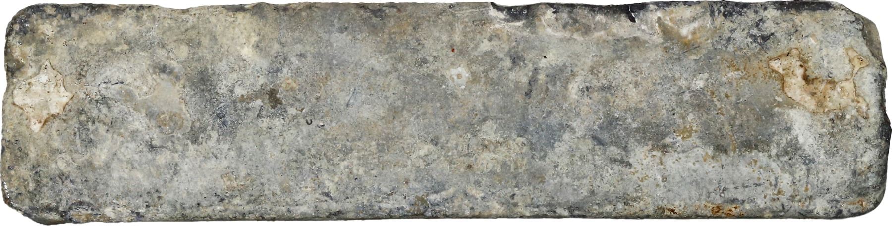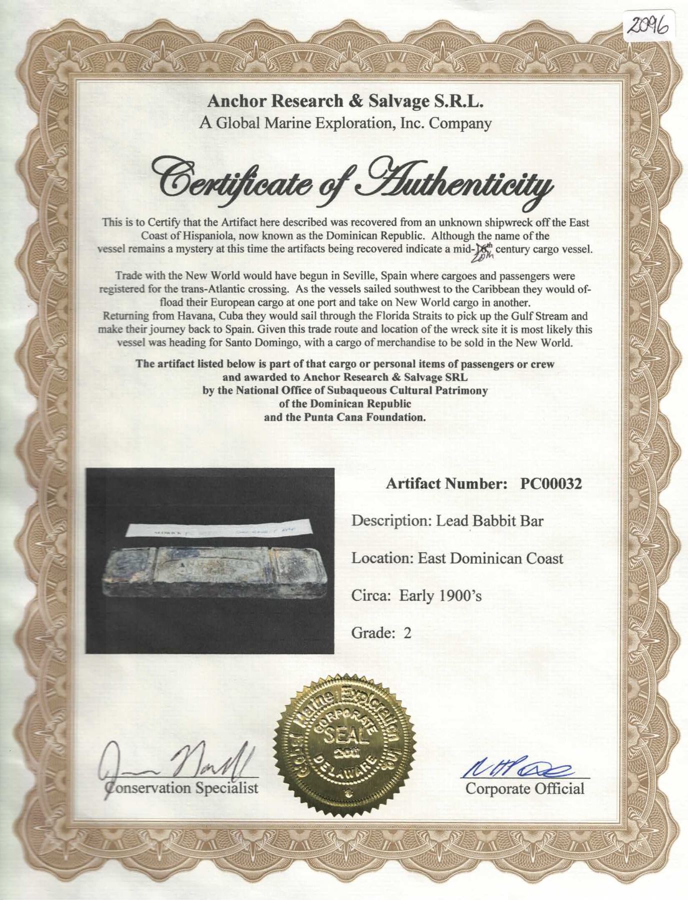 Lead ("manganese babbit") ingot, Syracuse Smelting Works (New York City), early 1900s, ex-unidentified mid-1900s wreck off Punta Cana, Dominican Republic. 2080 grams. 8½" x 2¼" x ¾". This thin ingot of typical shape, its lightly encrusted surface showing logos and company name and location, is composed of a mix of lead (80.25%), tin (5.00%) and antimony (14.75%) known commercially as "manganese babbitt" (named after Isaac Babbitt, 1799-1863). Per the manufacturer's literature, "There is no bearing that covers so wide a scope of service as Manganese Babbitt. Easy to cast. Makes a solid bearing and is practically self-lubricating. Especially adapted for auxiliary pumps bagasse carriers, beaters, calendars, car axles, chemical agitators, clay machinery, conveyors, cotton-mill machinery, cottonseed oil machinery crystallizer drives, driving shafts, elevators, Fourdriniers, hoisting machinery, hydraulic presses, knitting machinery, light capacity pumps, light capacity pumps, light saw-mills, mixing mills, pulverizes, sausage grinders, saw mandrills, saw tables, shapers, woodworking machinery." From an unidentified mid-1900s wreck off Punta Cana, Dominican Republic, with original photo-certificate PC00032 from the salvors, pedigreed to Sedwick Auction 14 (lot 1678).