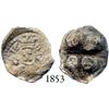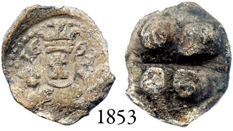 Lead textile seal dated 1663. 6.2 grams, about 3/4" in diameter. Small but boldly detailed one-sided seal with prongs on back, the design showing a small castle in shield with date 16-63 flanking the crown above, whitish in color an light encrustation. With photo-certificate #97-4449. From a mid-1600s Spanish colonial site in the southern Caribbean