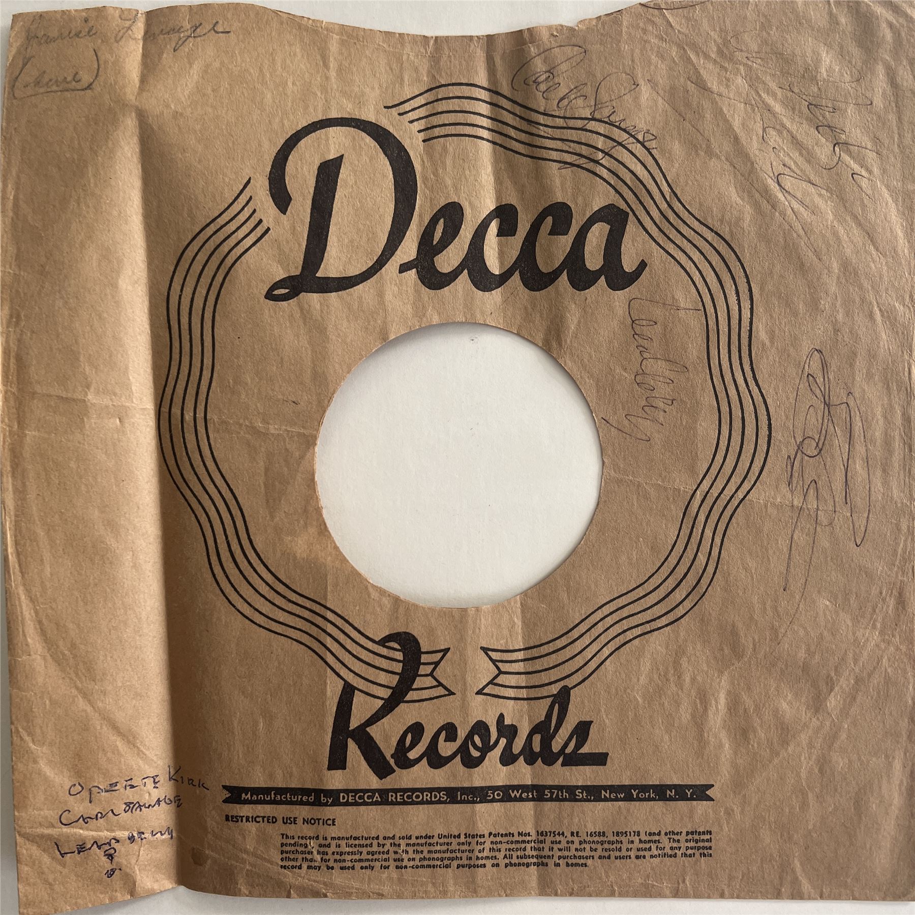 Leadbelly and bandmates signed Decca 45 record sleeve. Item does not have vinyl