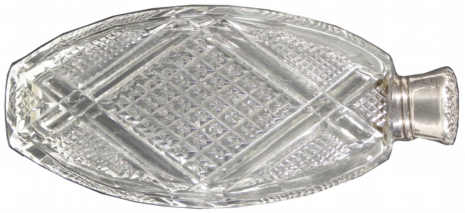 Leaded Glass Flask w/sterling silver lid. Lid engraved "L.F." with high relief décor. 5 1/2 inches tall.