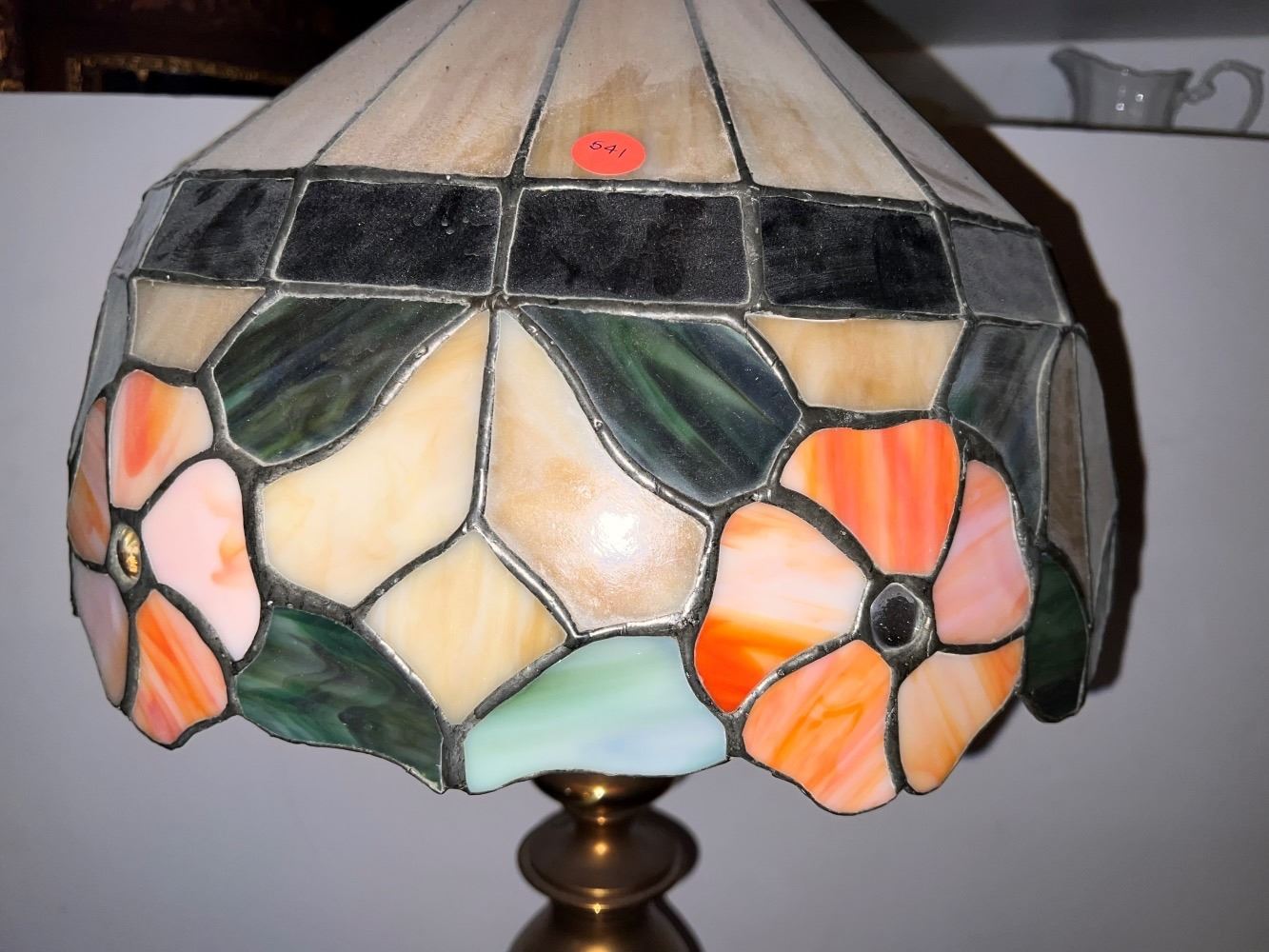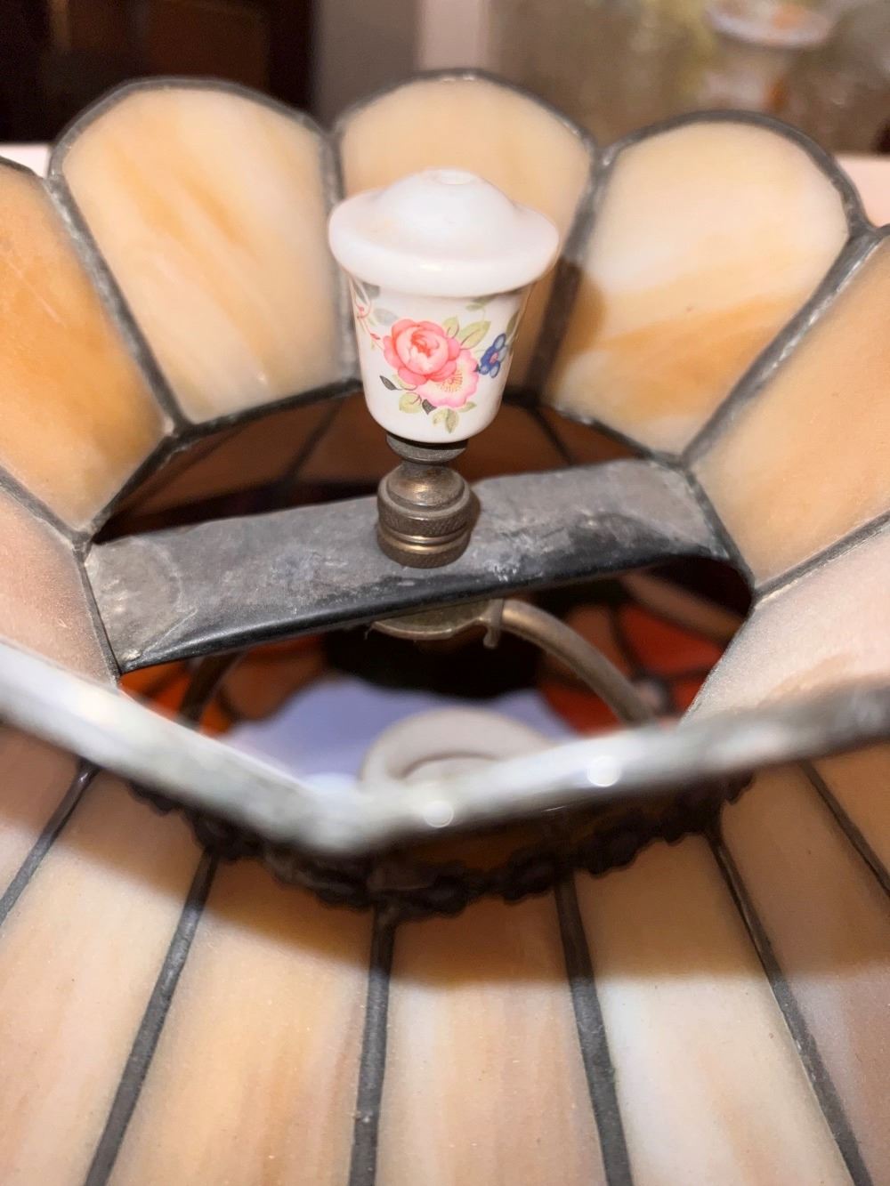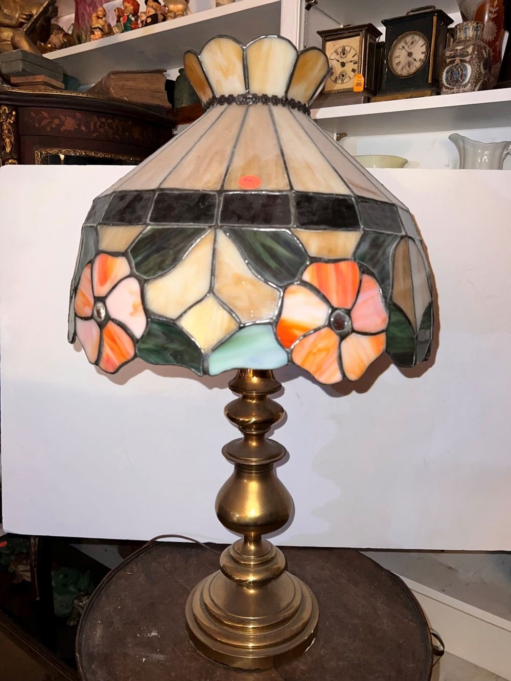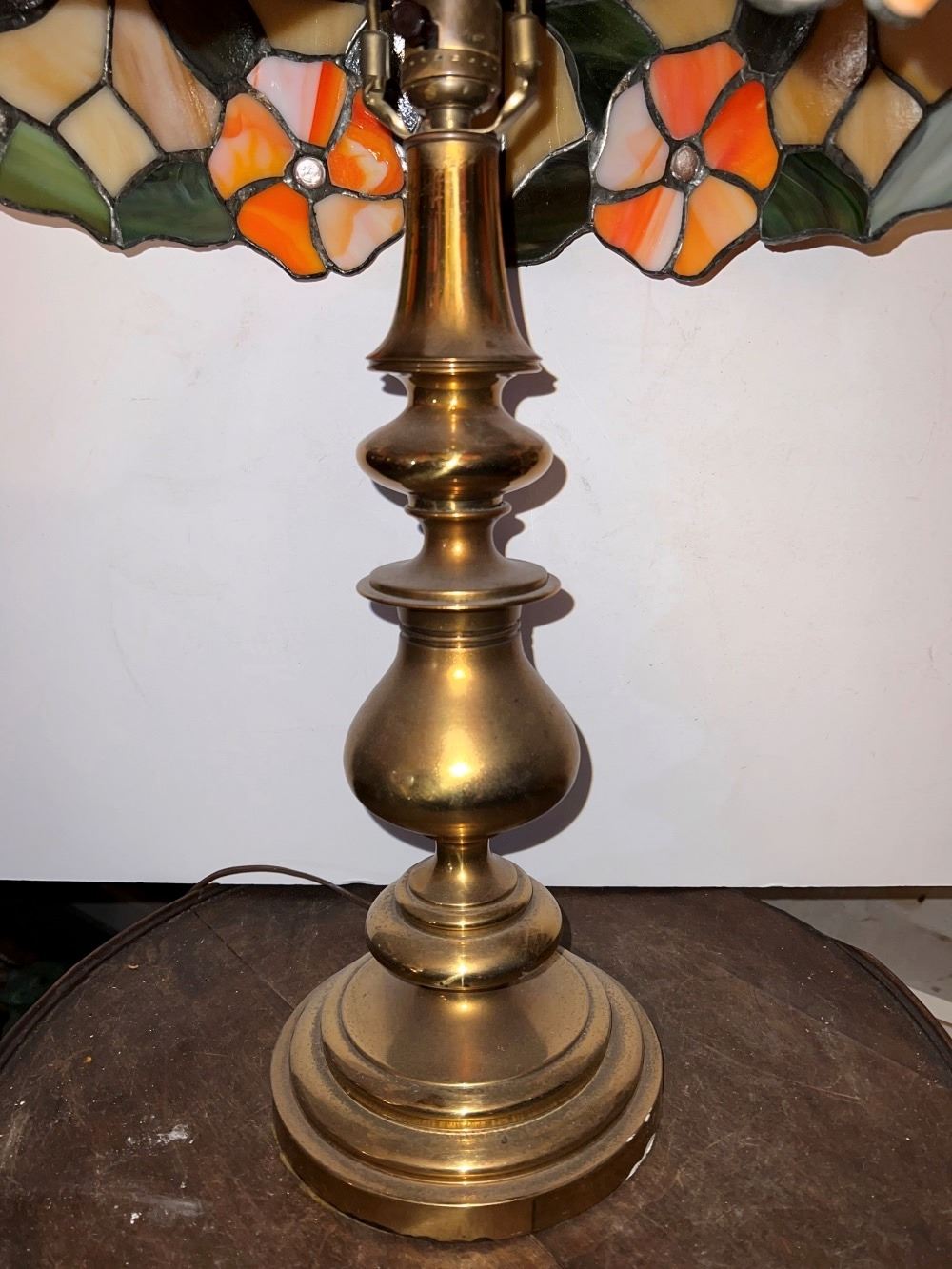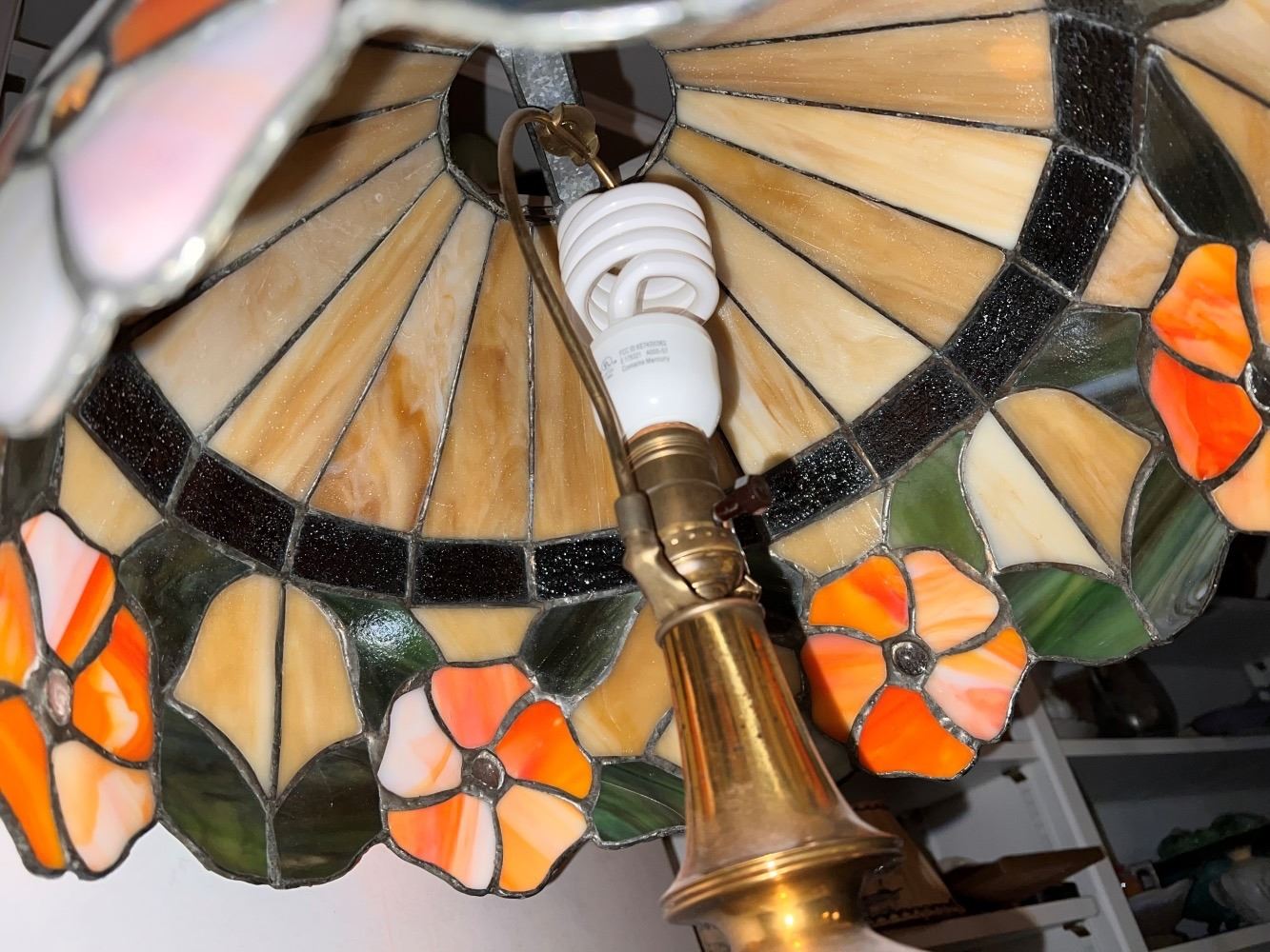 Leaded glass shade with pink and orange flowers, bass base. Measures approx. 27 inches tall x 16 inches wide.