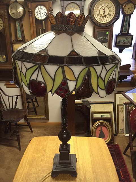 Beautiful leaded glass lamp shade with fruit and leaves all around border, nice, bright colors when lit, with base.