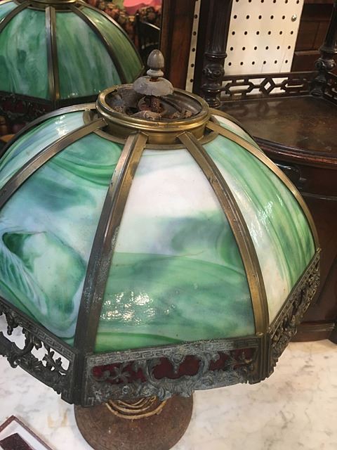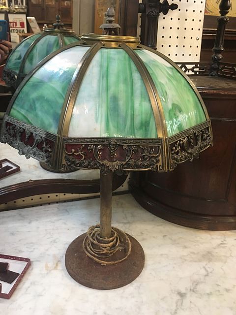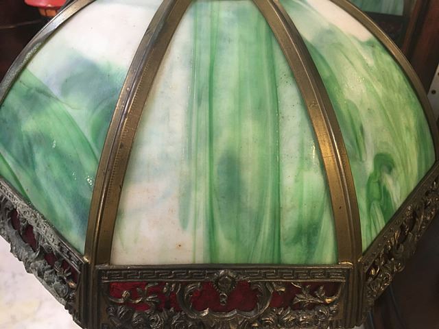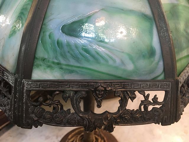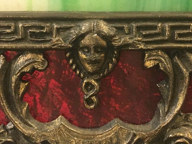 Green slag leaded glass table lamp with red glass border and ornate boarder design including busts. 1 red panel is broken, needs to be repaired or replaced, could be Miller Lamp Co.