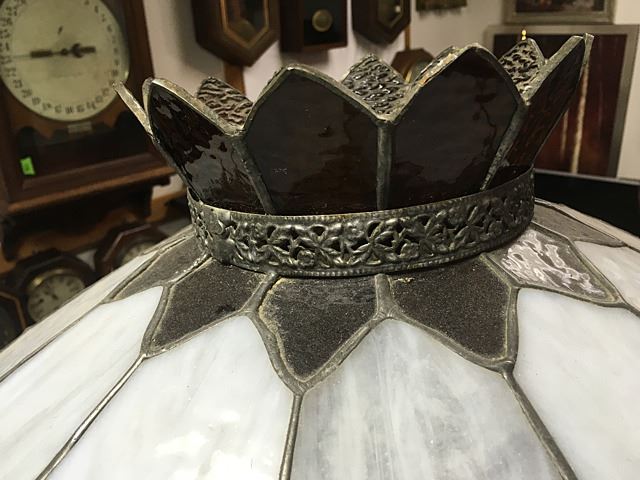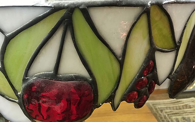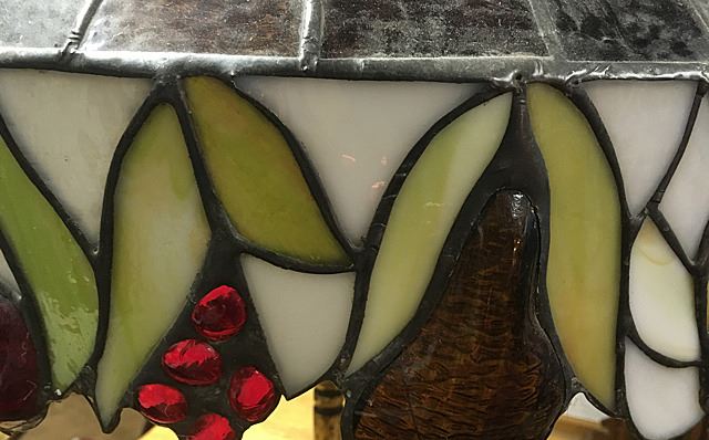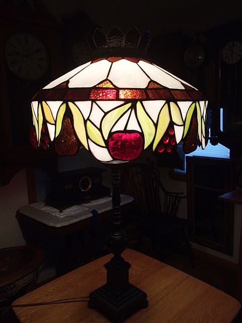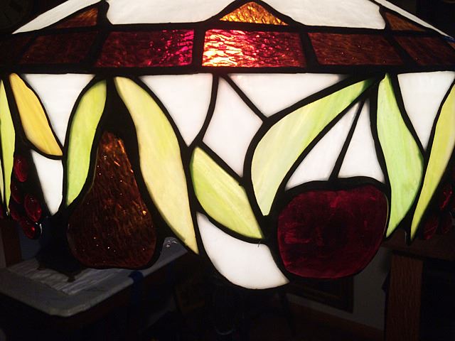 Beautiful leaded glass lamp shade with fruit and leaves all around border, nice, bright colors when lit, with base.